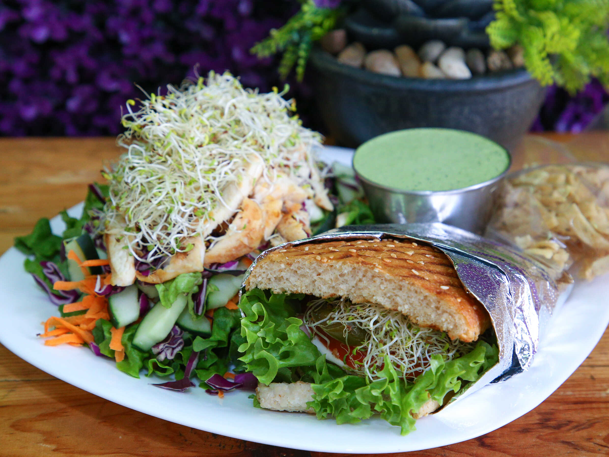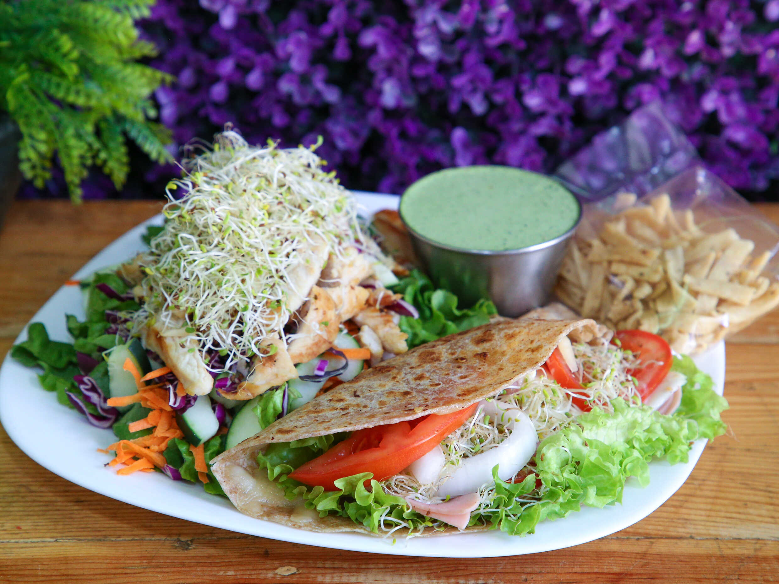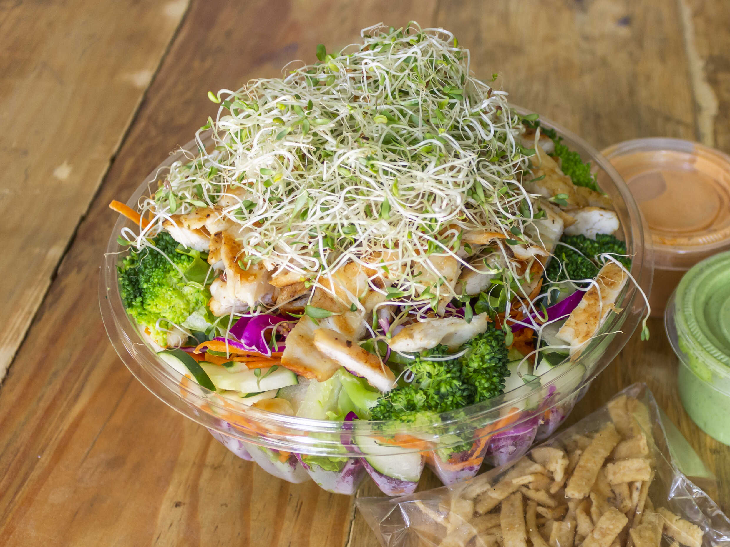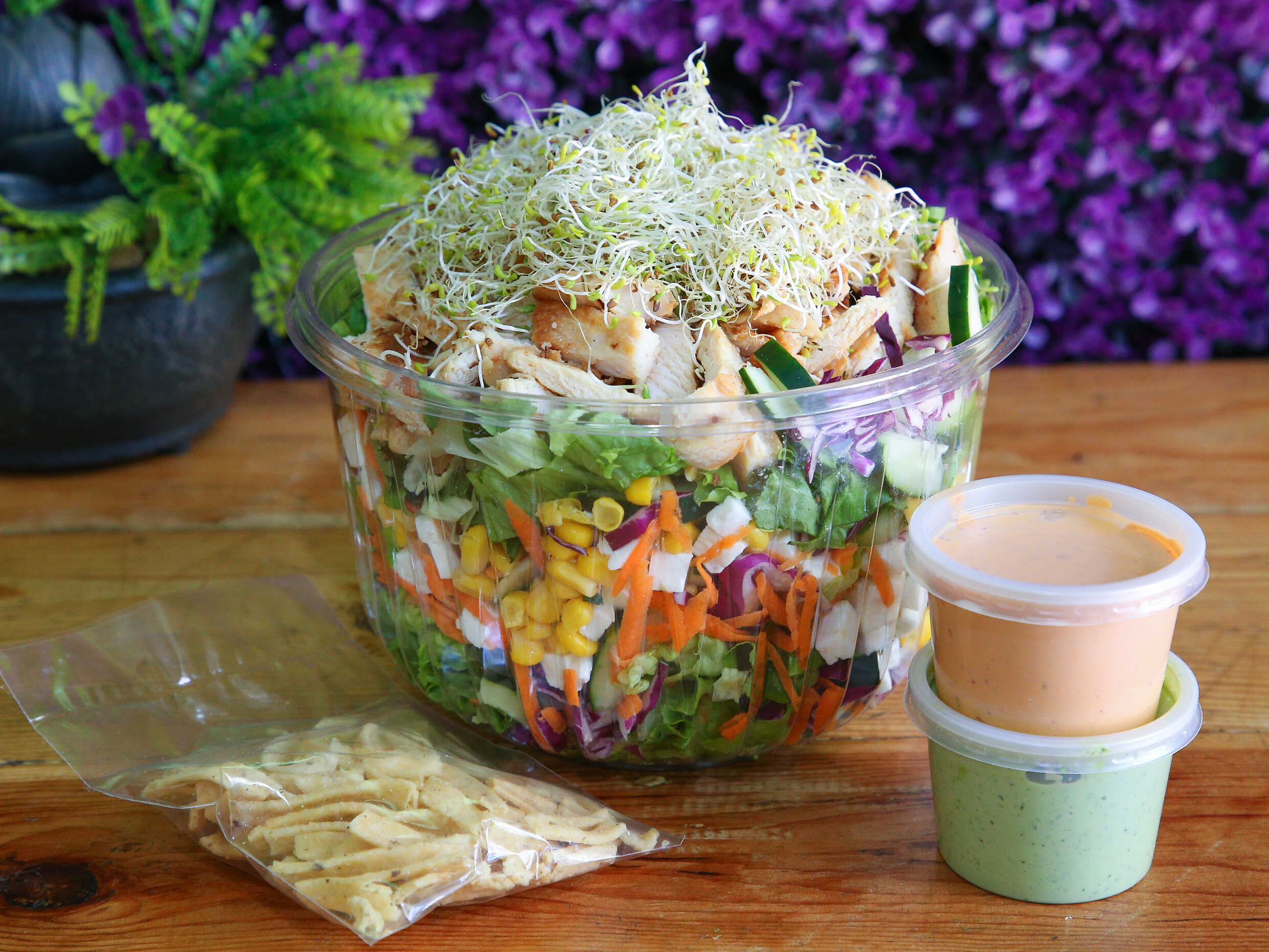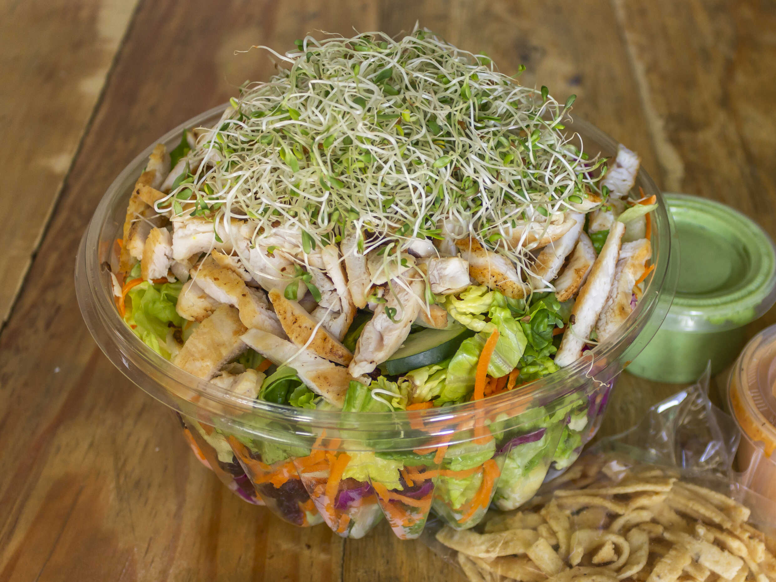 Base de lechuga, germinado, tortillita doradita, pollo a la plancha, 5 ingredientes a elegir, 2 aderezo a elegir.
