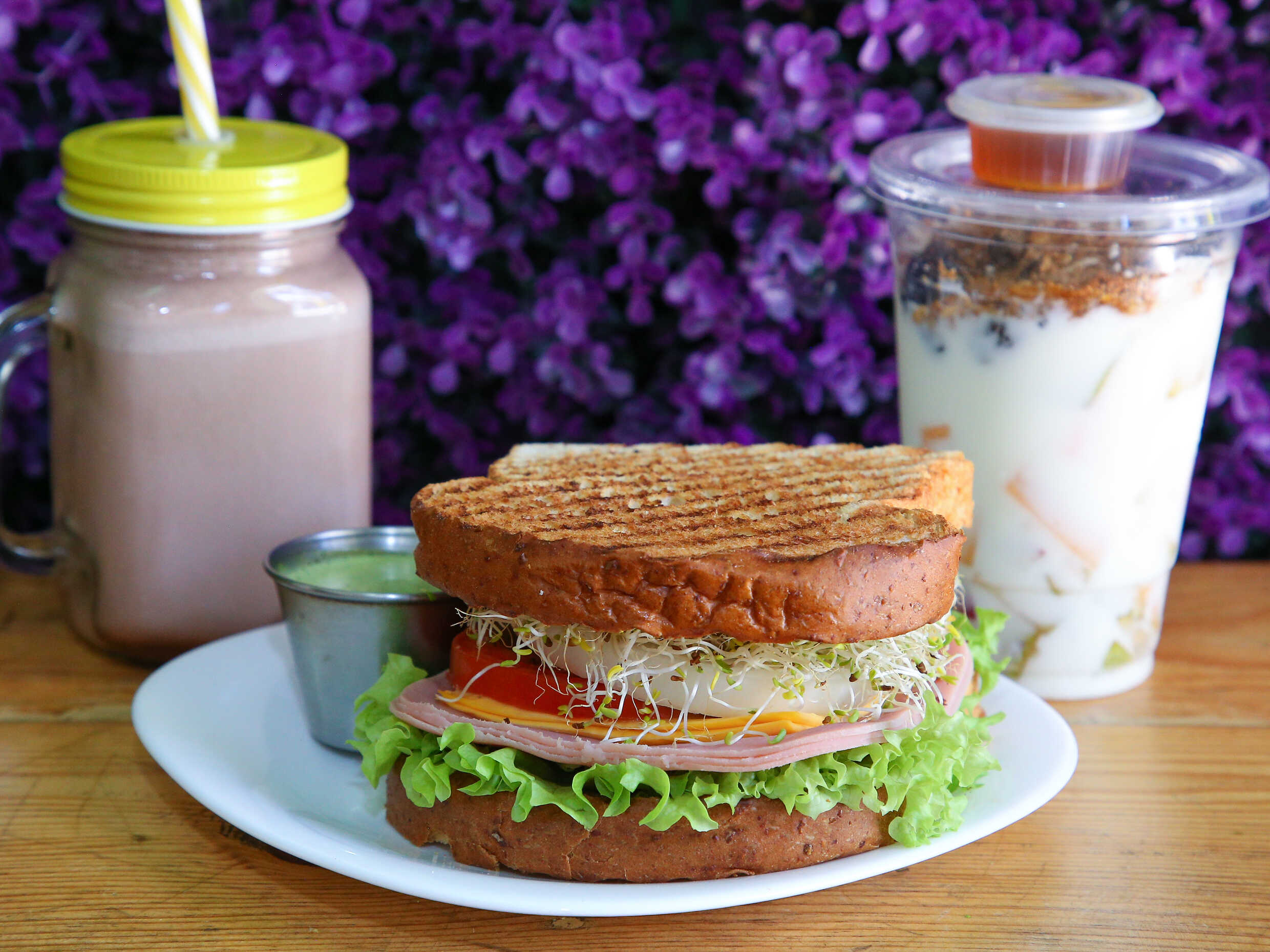 e jamón. Mas 1 licuado de chocomilk chico mas 1 yogurth chico. Elegir su aderezo cilantro, chipotle, ranch, cesar, mil islas, BBQ italiano.