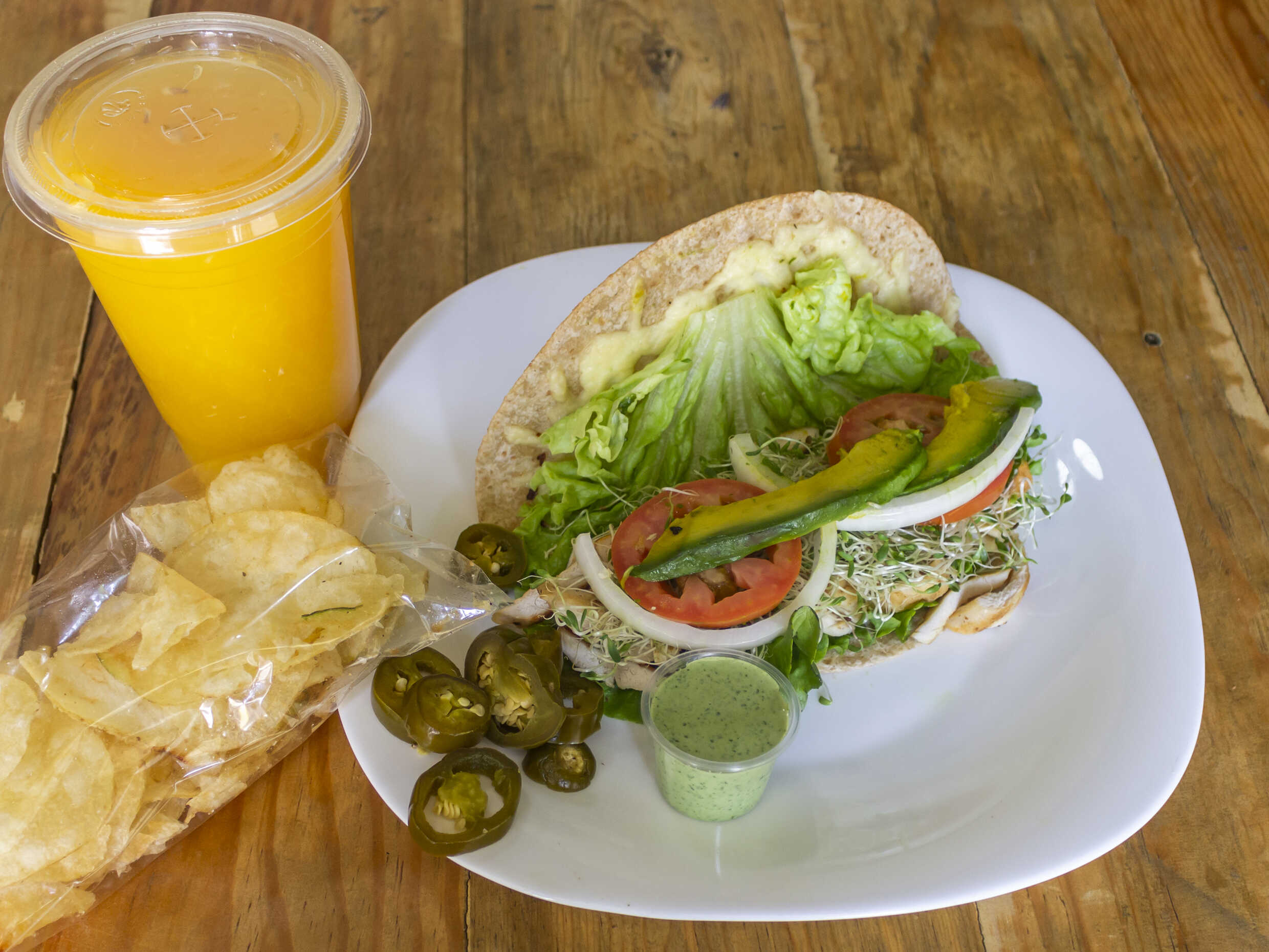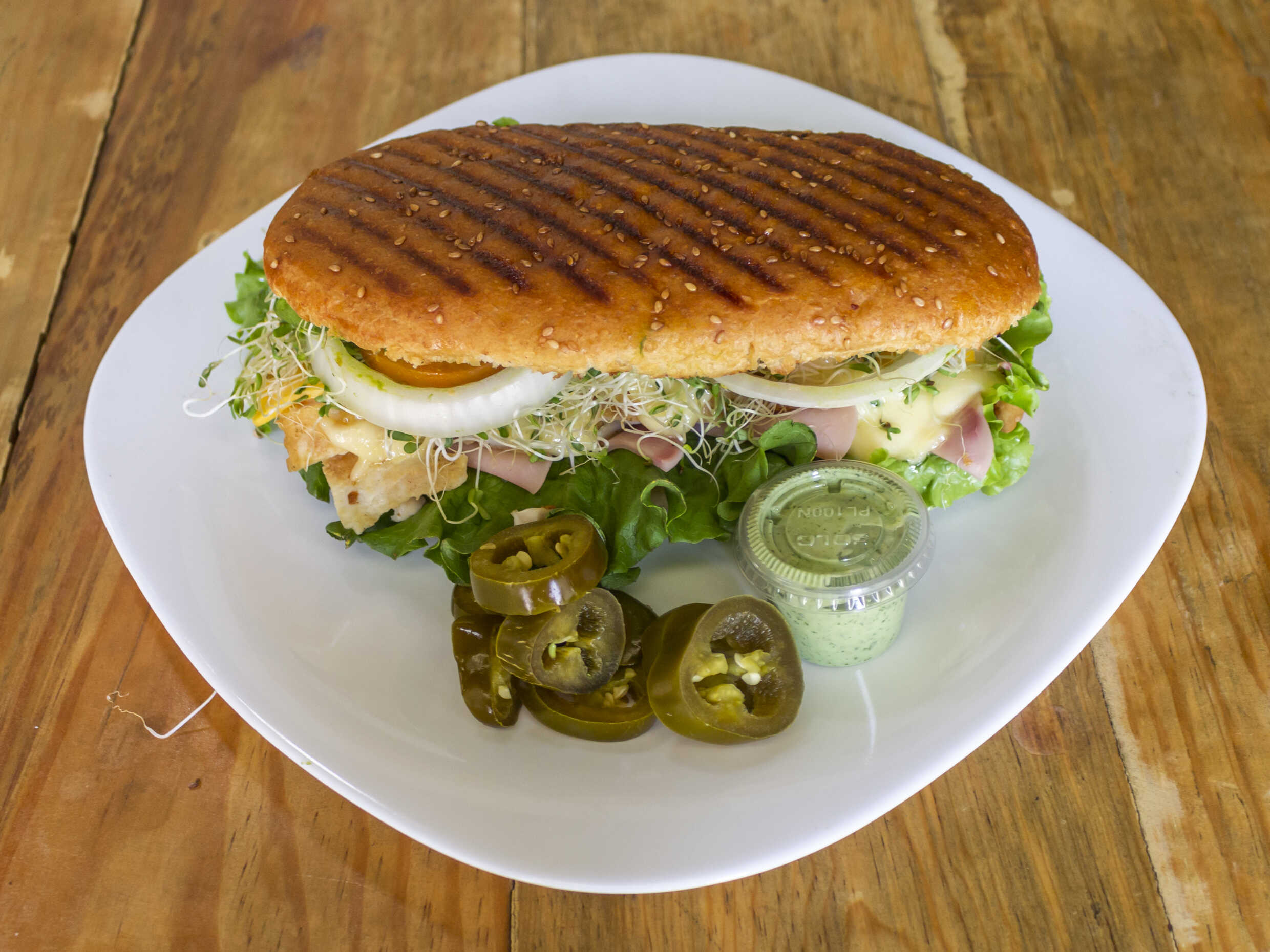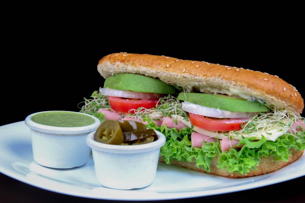 Incluye: jamón de pavo, lechuga, tomate, cebolla, chile, aguacate, germinado, mayonesa y queso americano. 1 aderezo a elegir cilantro, chipotle, ranch, cesar, mil islas, BBQ italiano.