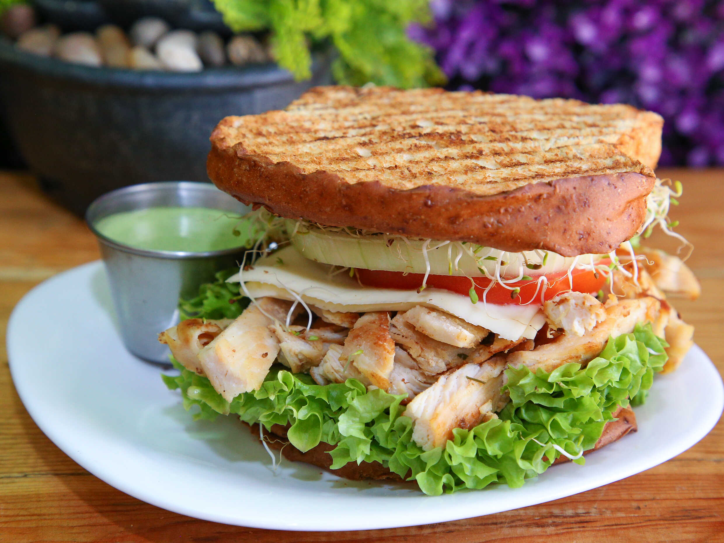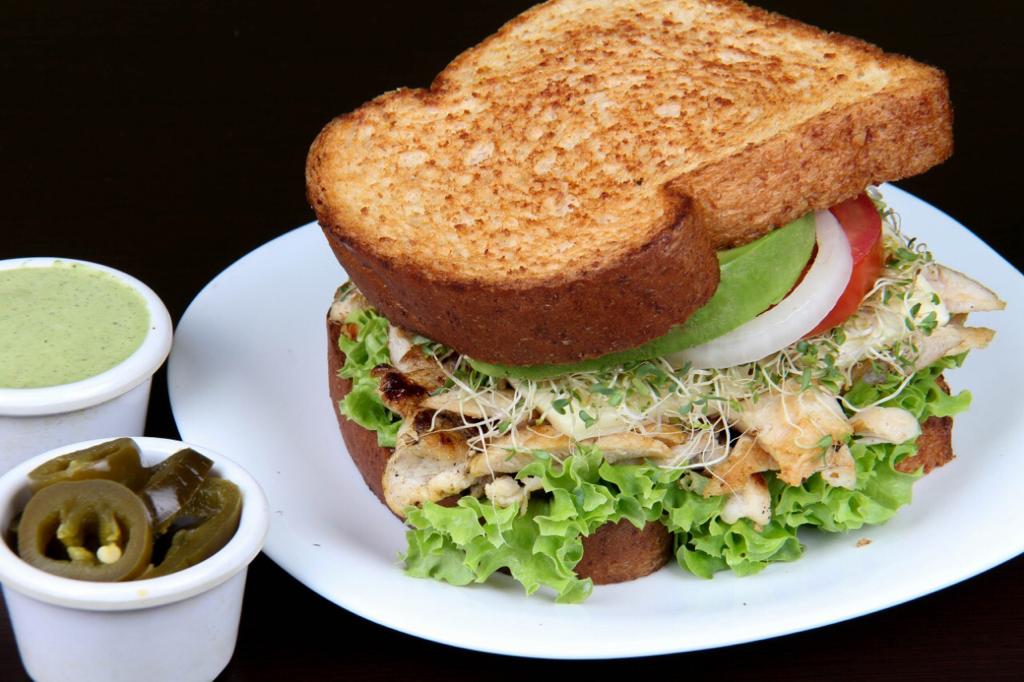 Incluye: pollo a la plancha lechuga, tomate, cebolla, chile, aguacate, germinado, mayonesa y queso manchego. 1 aderezo a elegir cilantro, chipotle, ranch, cesar, mil islas, BBQ italiano.