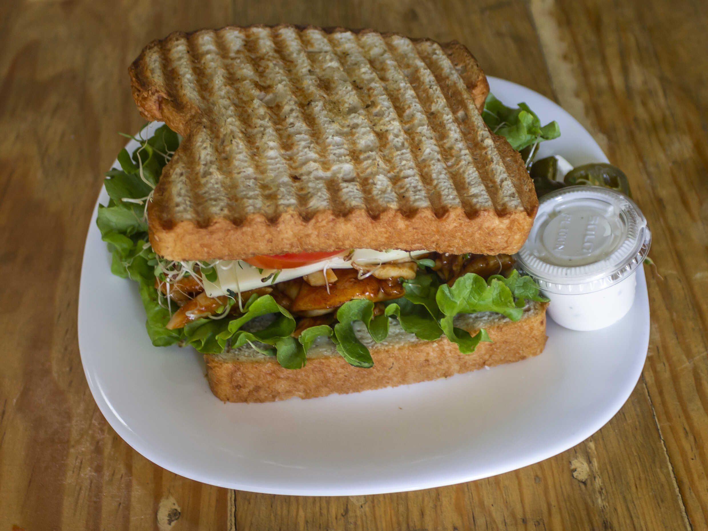 Incluye: pollo BBQ a la plancha, lechuga, tomate, cebolla, chile, aguacate, germinado, mayonesa y queso manchego. 1 aderezo a elegir cilantro, chipotle, ranch, cesar, mil islas, BBQ italiano.