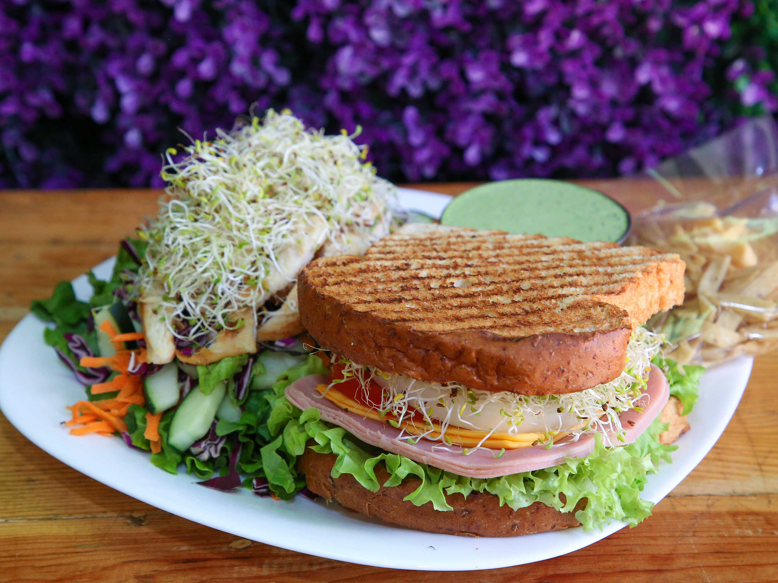 Incluye: pollo a la plancha y jamón de pavo, lechuga, tomate, cebolla, chile, aguacate, germinado, mayonesa y queso chihuahua. 1 aderezo a elegir cilantro, chipotle, ranch, cesar, mil islas, BBQ italiano.