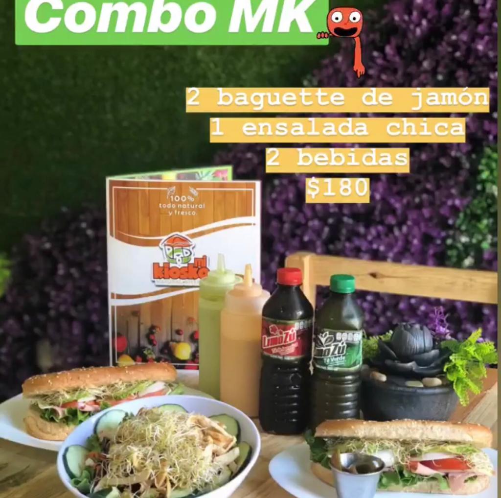 Incluye 1 ensalada chica tradicional elegir 1 aderezo. Cilantro chipotle, ranch, cesar, mil islas, bbq e italiano. Incluye 2 baguettes de jamón y 2 bebidas a elegir, te, jamaica, fresa kiwi, fresa limón.