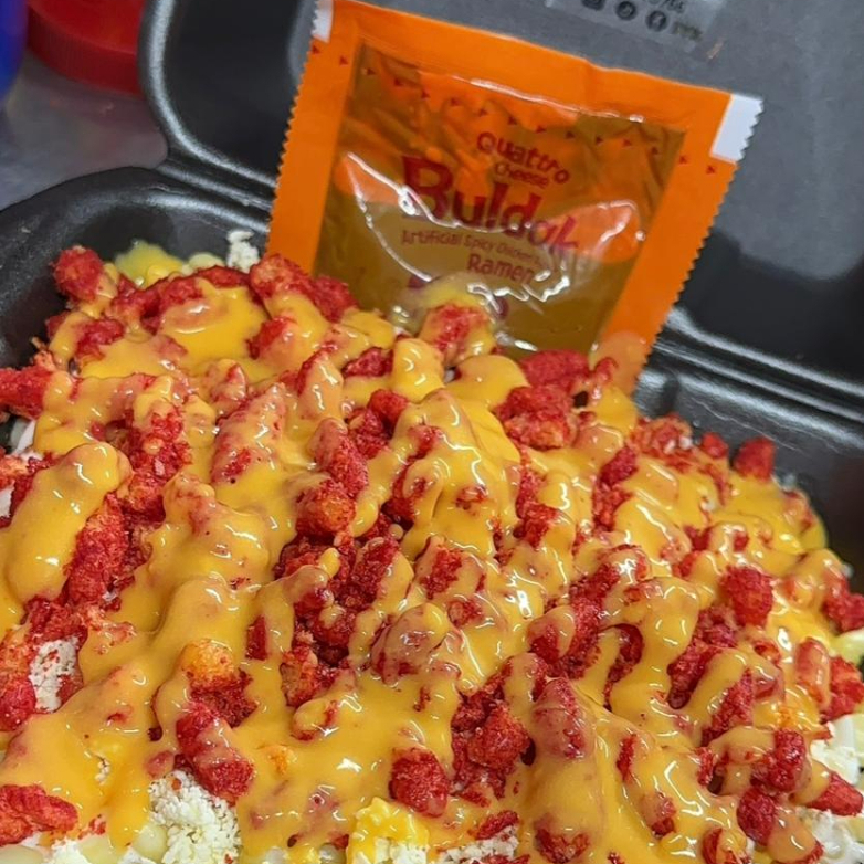 Buldak a elegir (queso o carbonara) esquite con crema,queso,mayonesa y aderezo