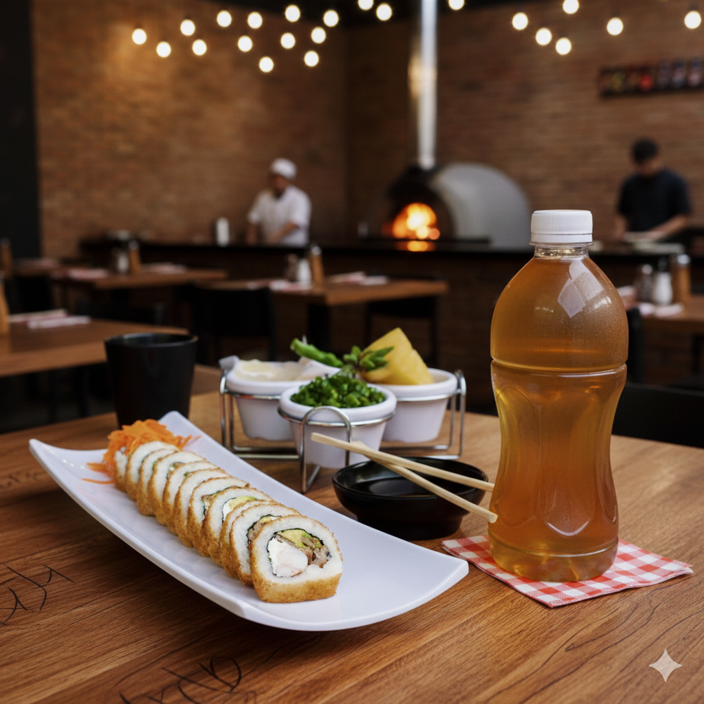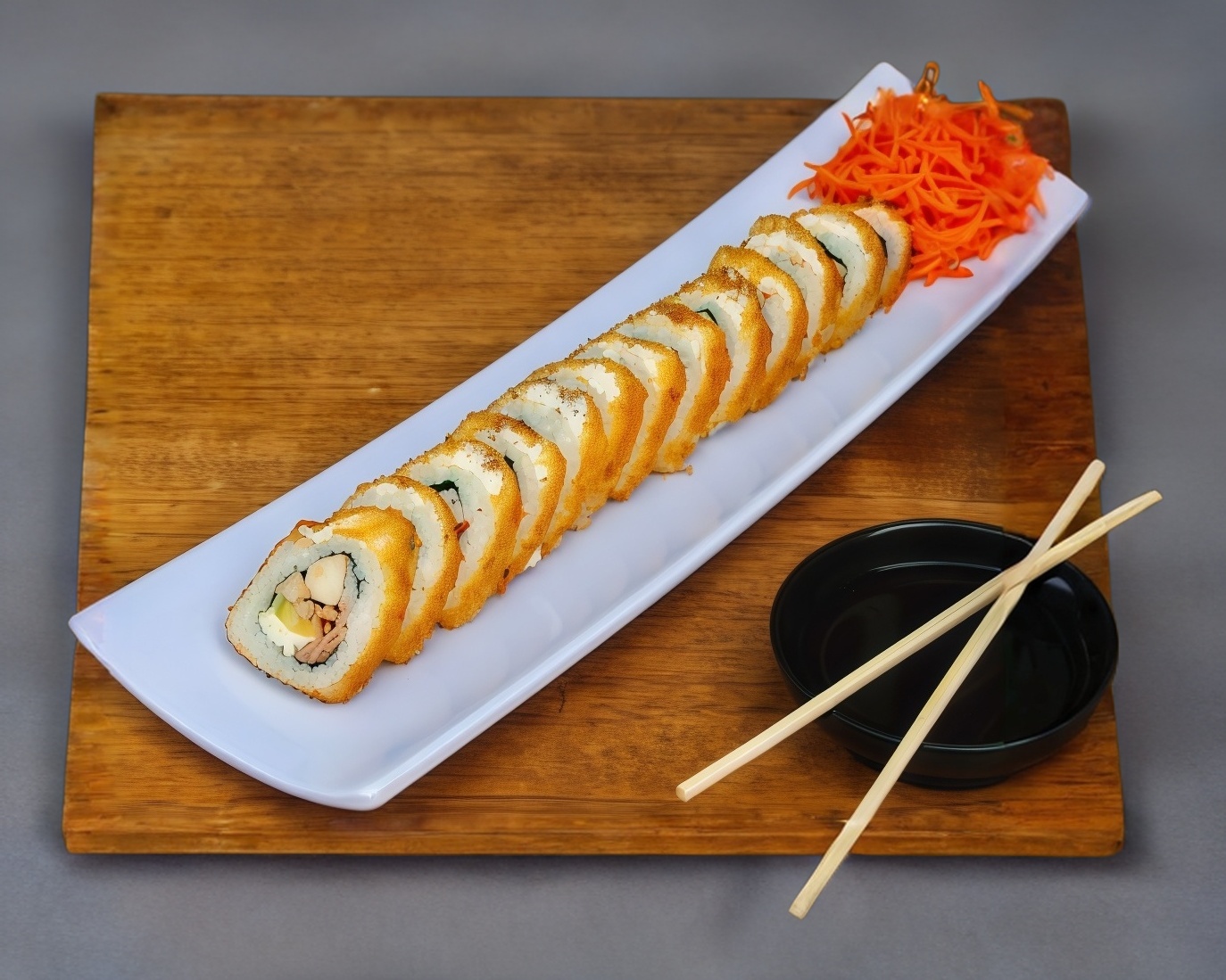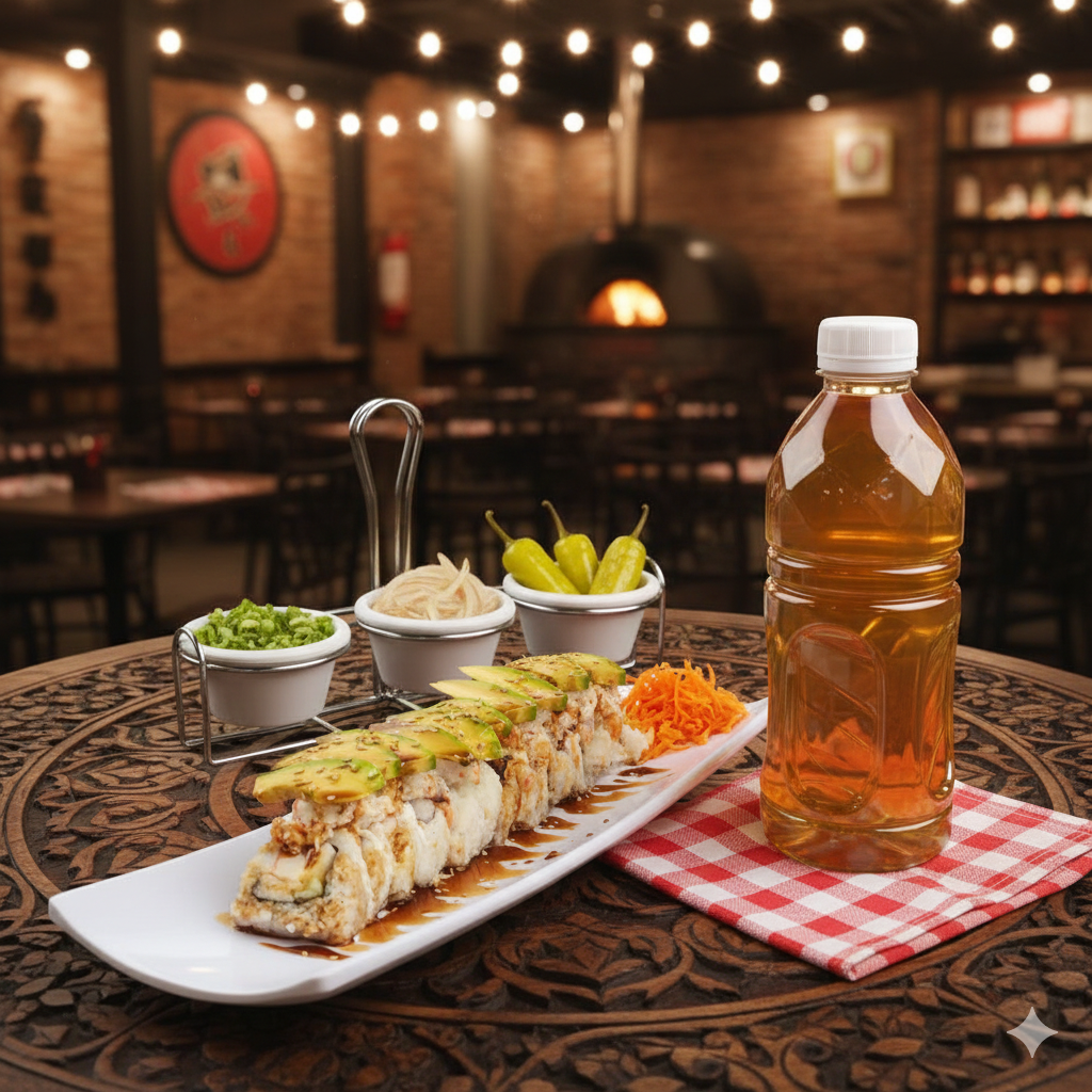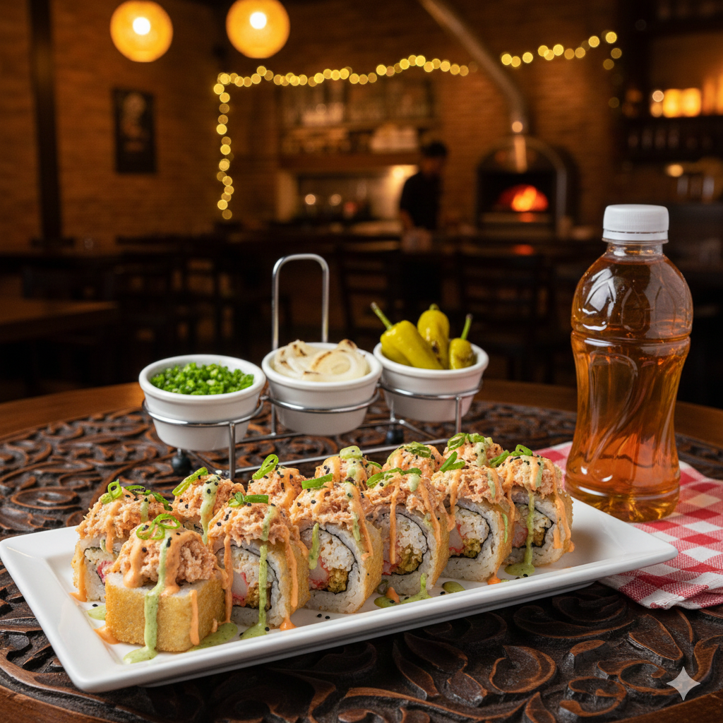 Rollo de 10-12 pzas. de camarón, aguacate, pepino, cangrejo, phila, queso, jalapeño, cebolla, pulpo frito, salsa veneno.