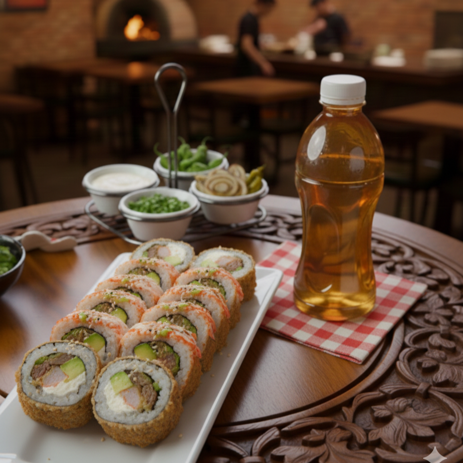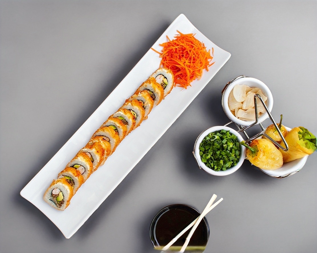 Rollo de Cangrejo, Pepino, Fuera Phila, Camarón, Pulpo, Tampico, Aguacate, Salsa Anguila,Ajonjolí.