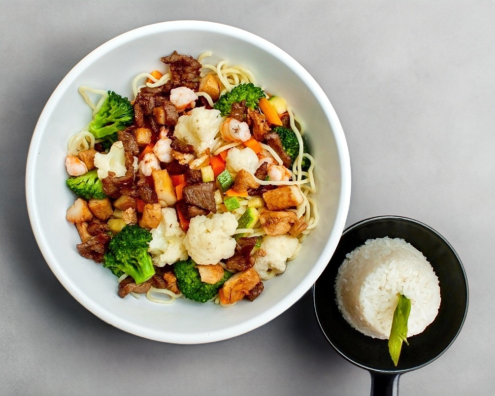 Pollo, res, camarón ó mixto, frijolillo, elote, zanahoria, brócoli, coliflor, calabaza, salsa tepanyaki.