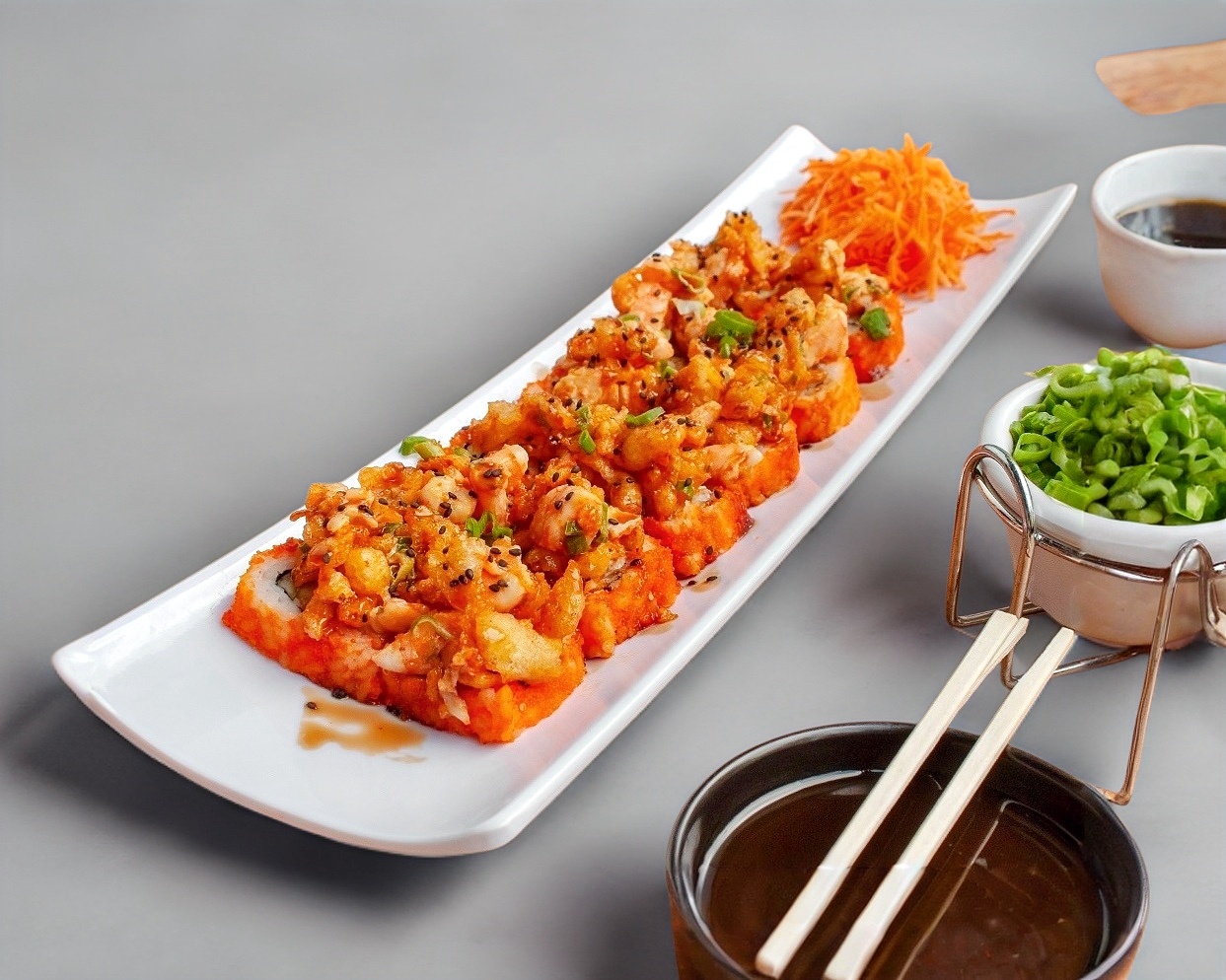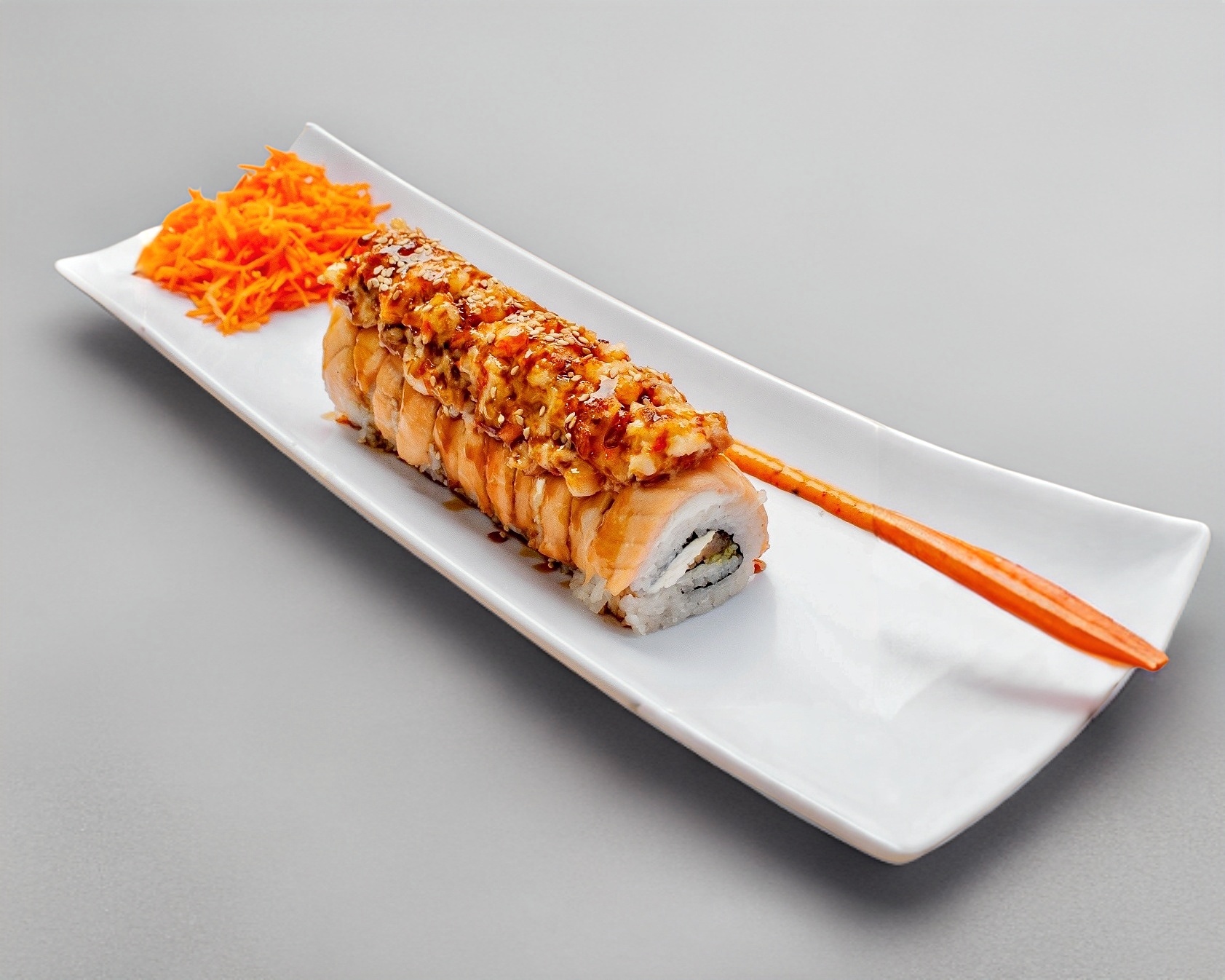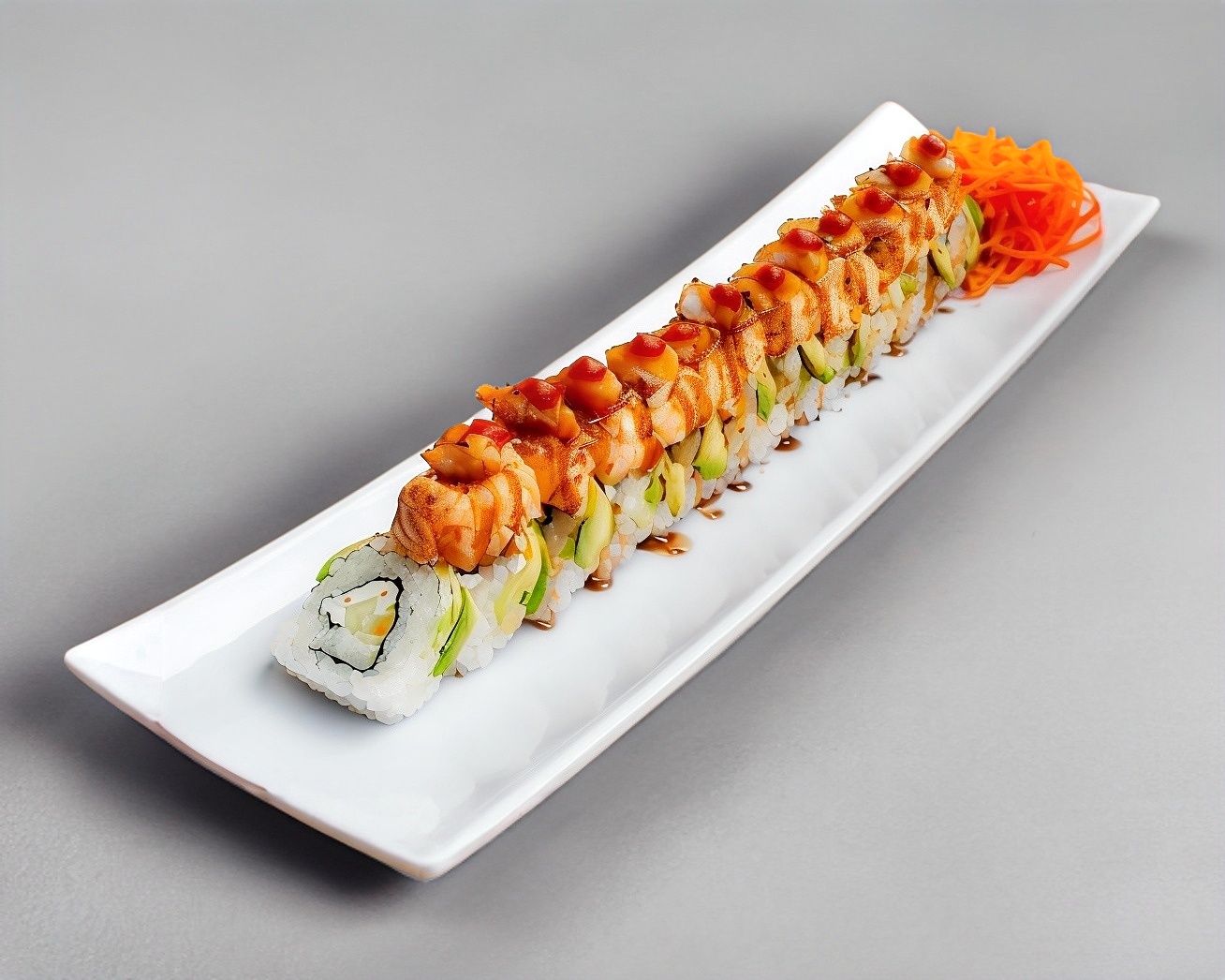 Rollo de 10-12 Pzas. Relleno de Phila, Aguacate, Pepino, Camarón Rocks, Envuelto en Salmón, Salsa Spicy y Anguila.