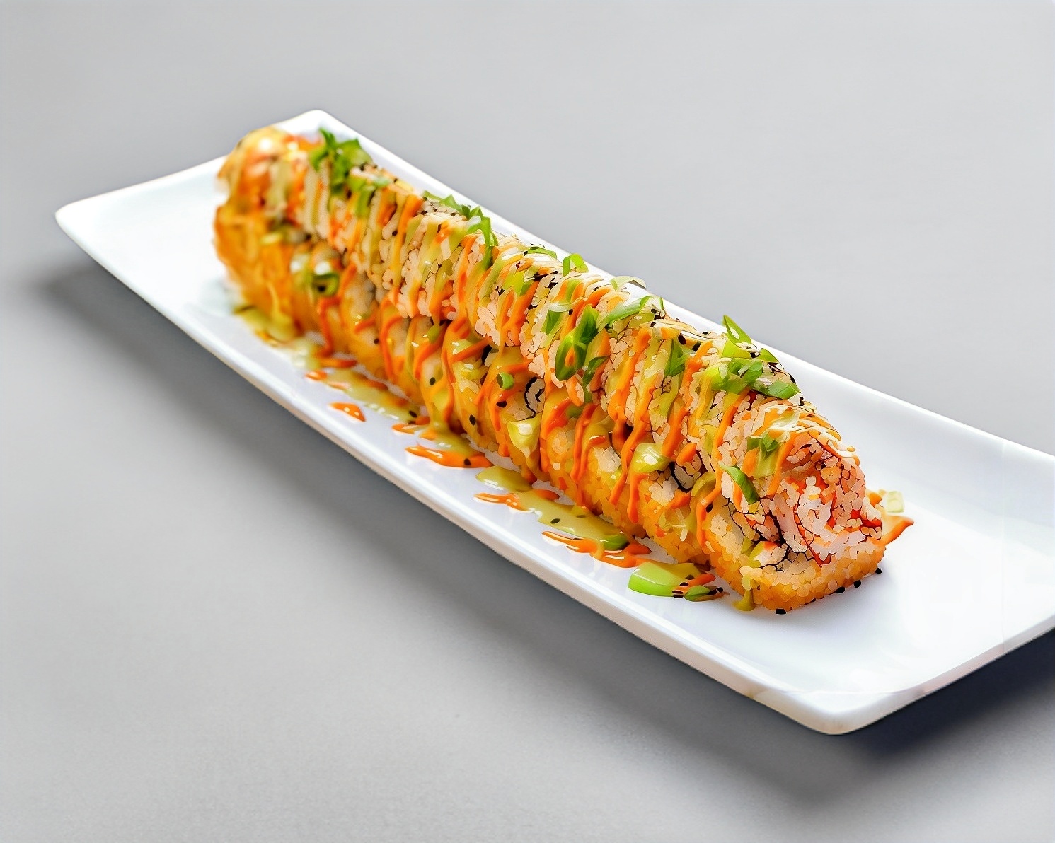 Rollo relleno de phila, aguacate, surimi, tampico con tocino, aderezo spicy, cilantro, ajonjolí.