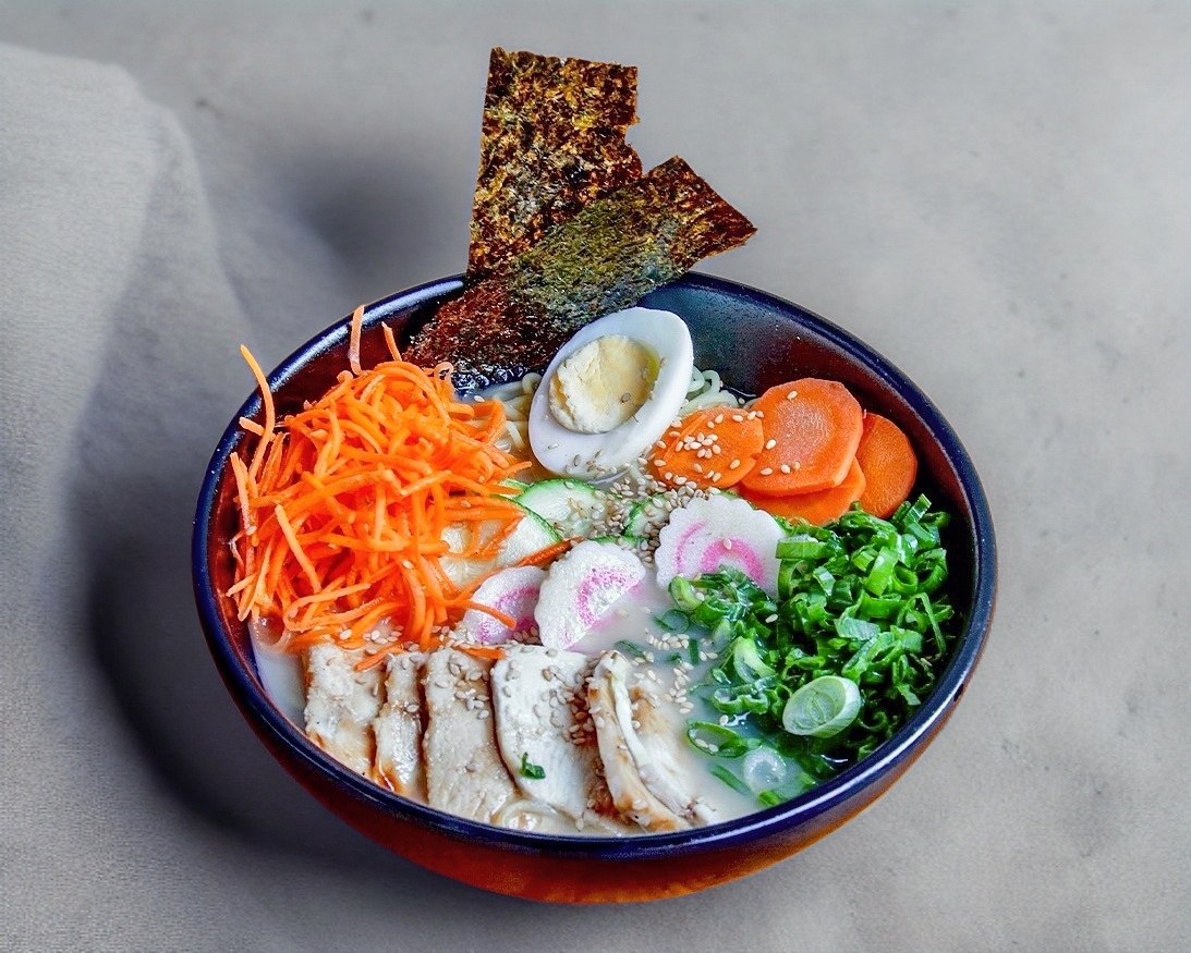 Sopa ramen a base tonkotzu, calabaza, elote grano, zanahoria, naruto, cebollín, ajonjolí, espinaca, hongo, alga, huevo y pollo.