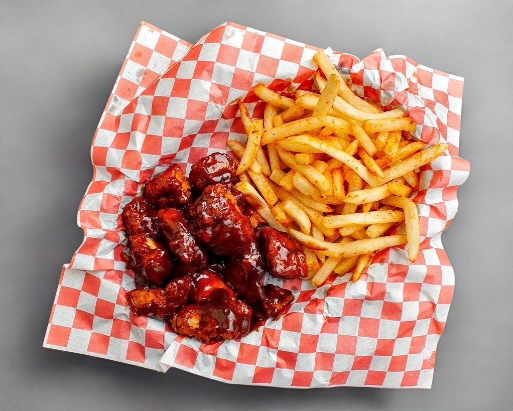 Pollo capeado 300 gr con 1 salsa a elección y acompañamiento a elegir con aderezo ranch.