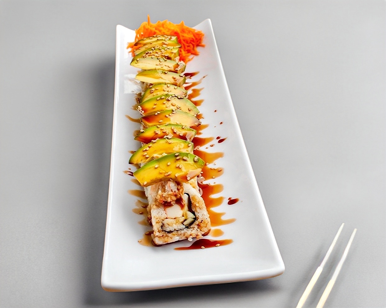 Rollo Relleno de Phila, Pepino, Aguacate, con Topping Crack, Salsa Anguila y Puntos Salsa Spicy.