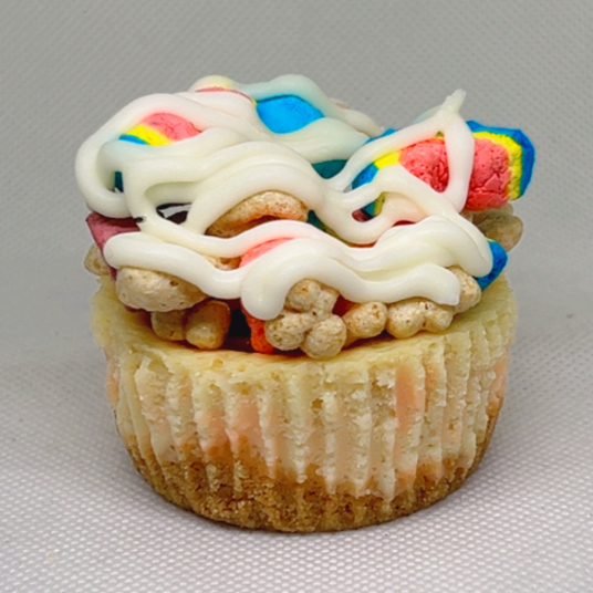 Mini Cheesecake con topping de lucky charms y chocolate.