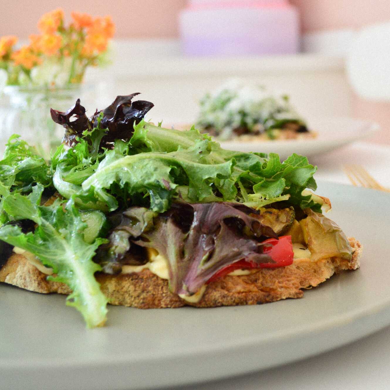 Pan de masa madre, vegetales rostizados, vinagreta de romero, balsámico y dijonesa.
