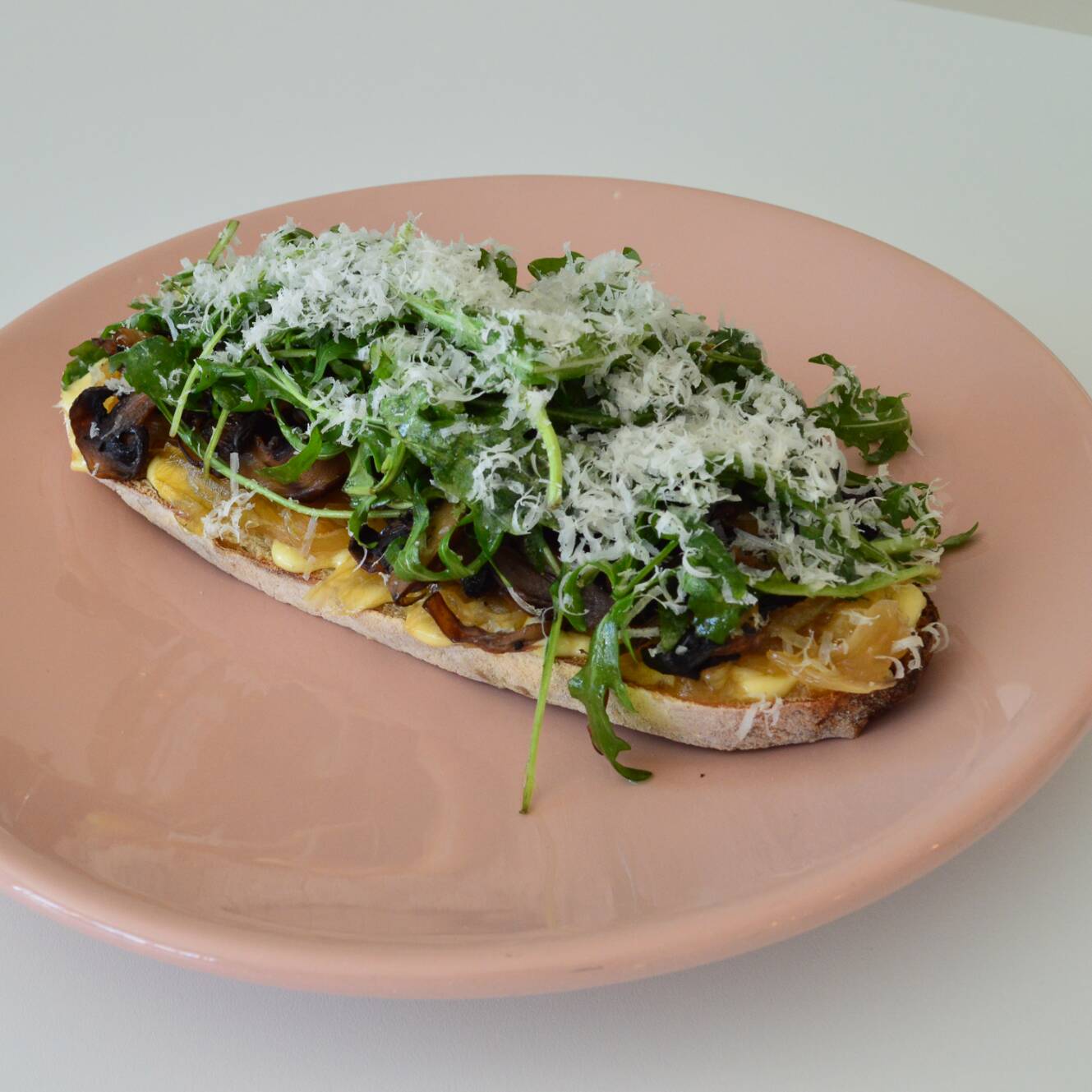 Pan de masa madre, cebolla caramelizada, hongos salteados, cebollín, parmesano y dijonesa.