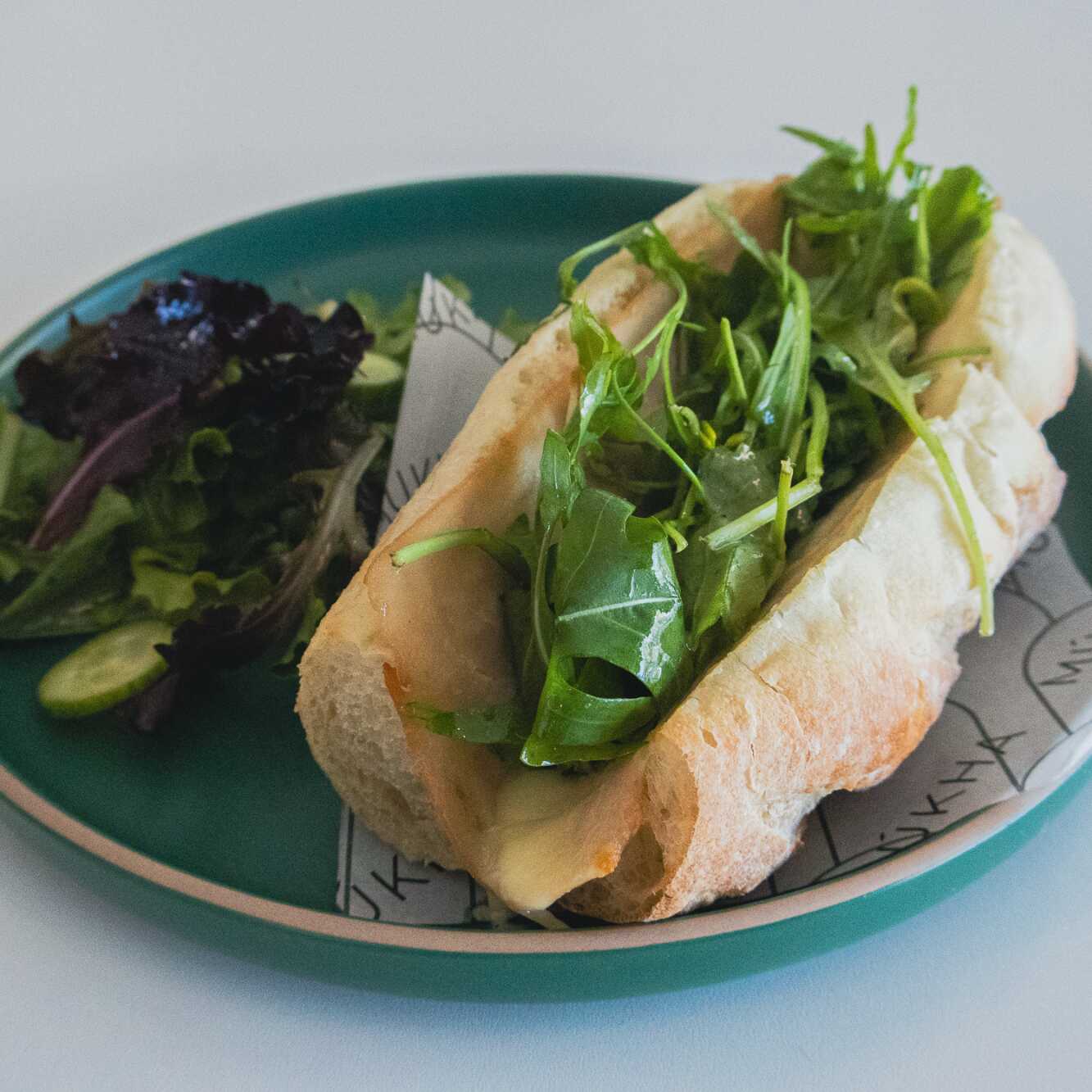 Baguette, dijonesa, jamón de pavo, queso manchego madurado y hojas.