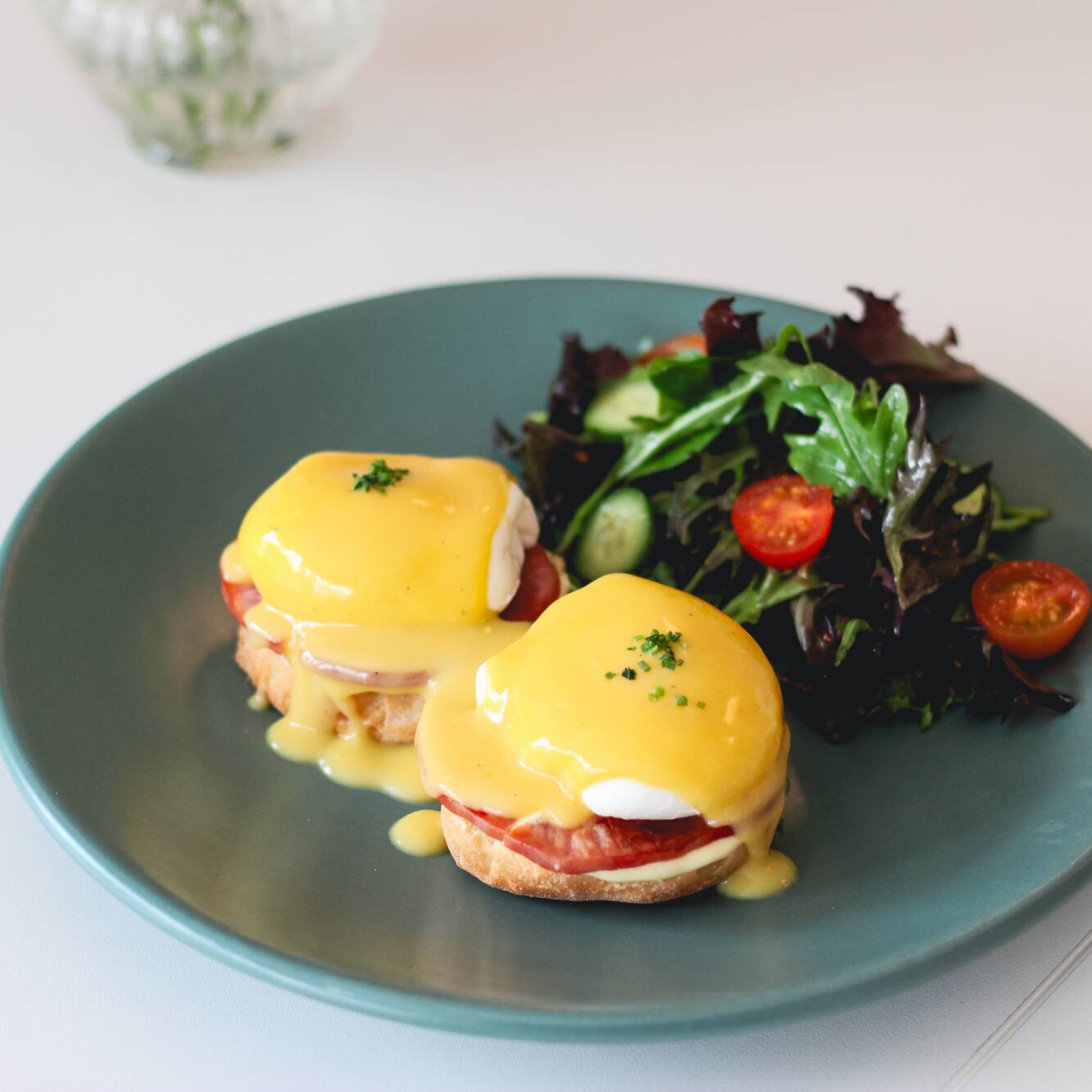 Huevos pochados, salsa holandesa, english muffin y jamón ahumado.