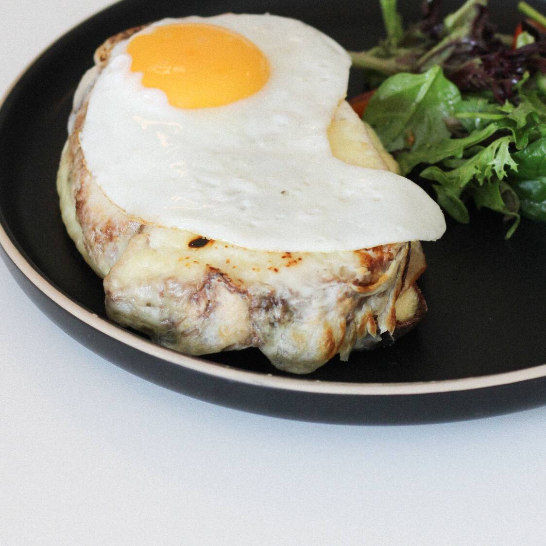 Pan de masa madre, jamón de pavo, queso manchego madurado y salsa bechamel con huevo frito.