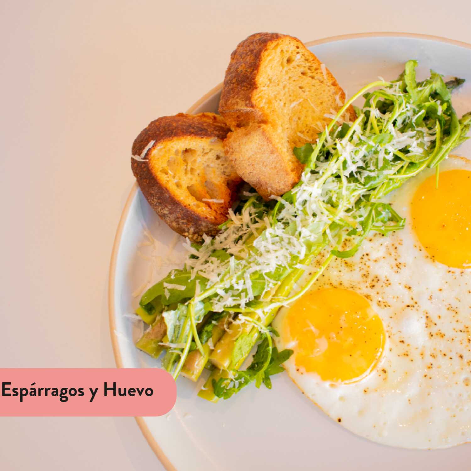 Espárragos salteados, huevos estrellados, queso parmesano y hojas.