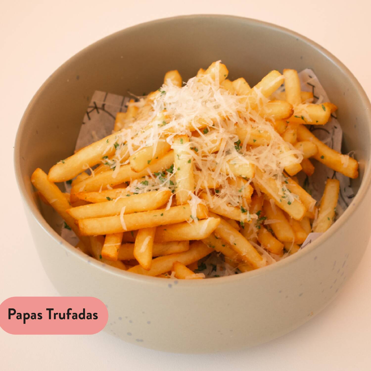 Papas fritas, parmesano y aceite de trufa blanca.