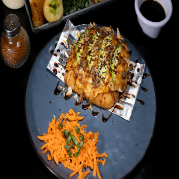MEZCLA DE RES, POLLO, TSURIMI, QUESO CH, PHILADELPHIA Y ARROZ EMPANIZADA, GRATINADA CON TROZOS DE TOCINO