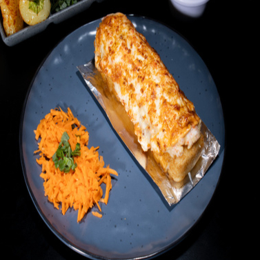 ROLLO DE CAMARONES, AGUACATE, PEPINO, PHILADELPHIA POR DENTRO, POR FUERA UNA PASTA DE QUESOS AL HORNO DE RES Y POLLO
