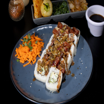 ROLLO DE AGUACATE, PEPINO Y PHILADELPHIA POR DENTRO; POR ENCIMA LLEVA UN TOPPING DE CEVICHE DE ATUN MUNCHYS DELICIOSO, DECORADO CON AJONJOLI