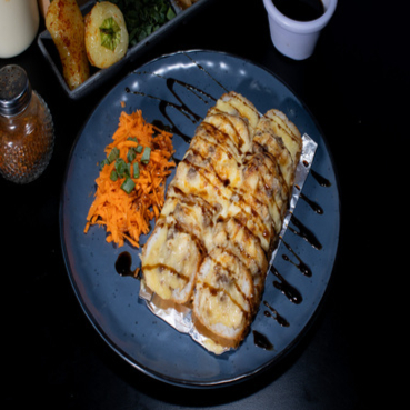 ROLLO DE POLLO Y TOCINO, AGUACATE, PEPINO Y PHILADELPHIA, POR FUERA GRATINADO ESPECIAL CON TROZOS DE RES + SALSA ANGUILA PARA ACOMPAÑAR