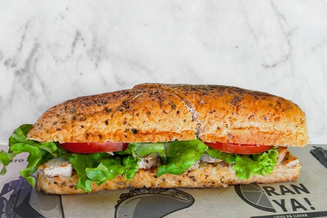 Baguette con proteína a elegir, con lechuga, tomate, cebolla y aguacate. Con un aderezo a elegir
