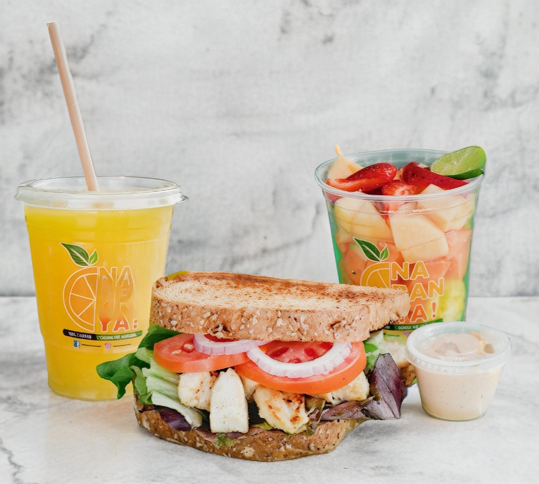 Fruta de Temporada*1 + Jugo de Naranja*1 + Sándwich de Pollo*1