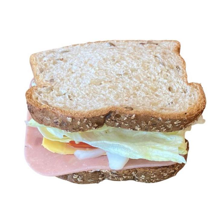 Jamón virginia, queso americano, lechuga, tomate y cebolla.