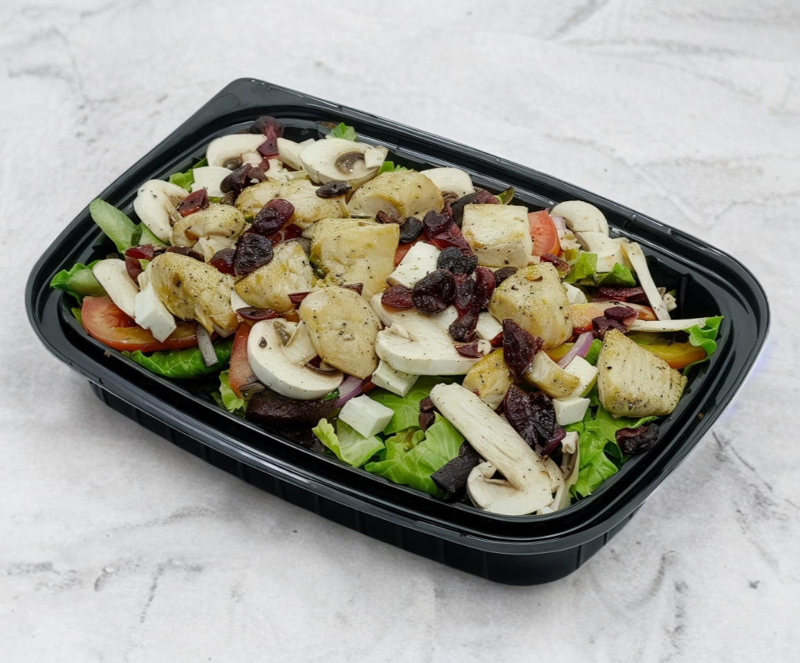 Pollo, mix de lechugas, fritura, tomate, cebolla, pepino, queso panela, arándano, fresa y jamón.