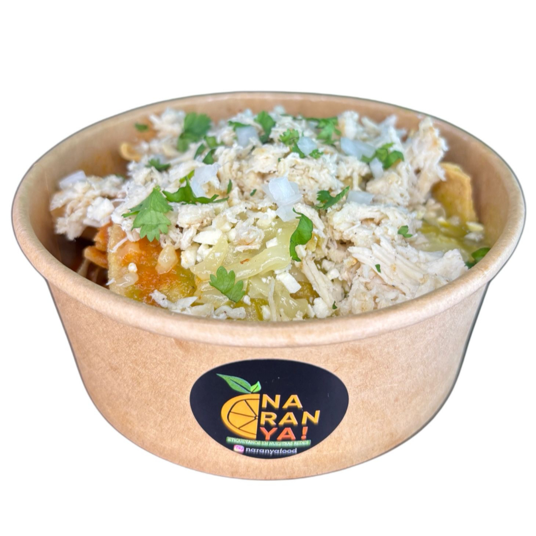 Chilaquiles con pollo, salsa a elegir, con queso gratinado, queso cotija, crema, cebolla y cilantro