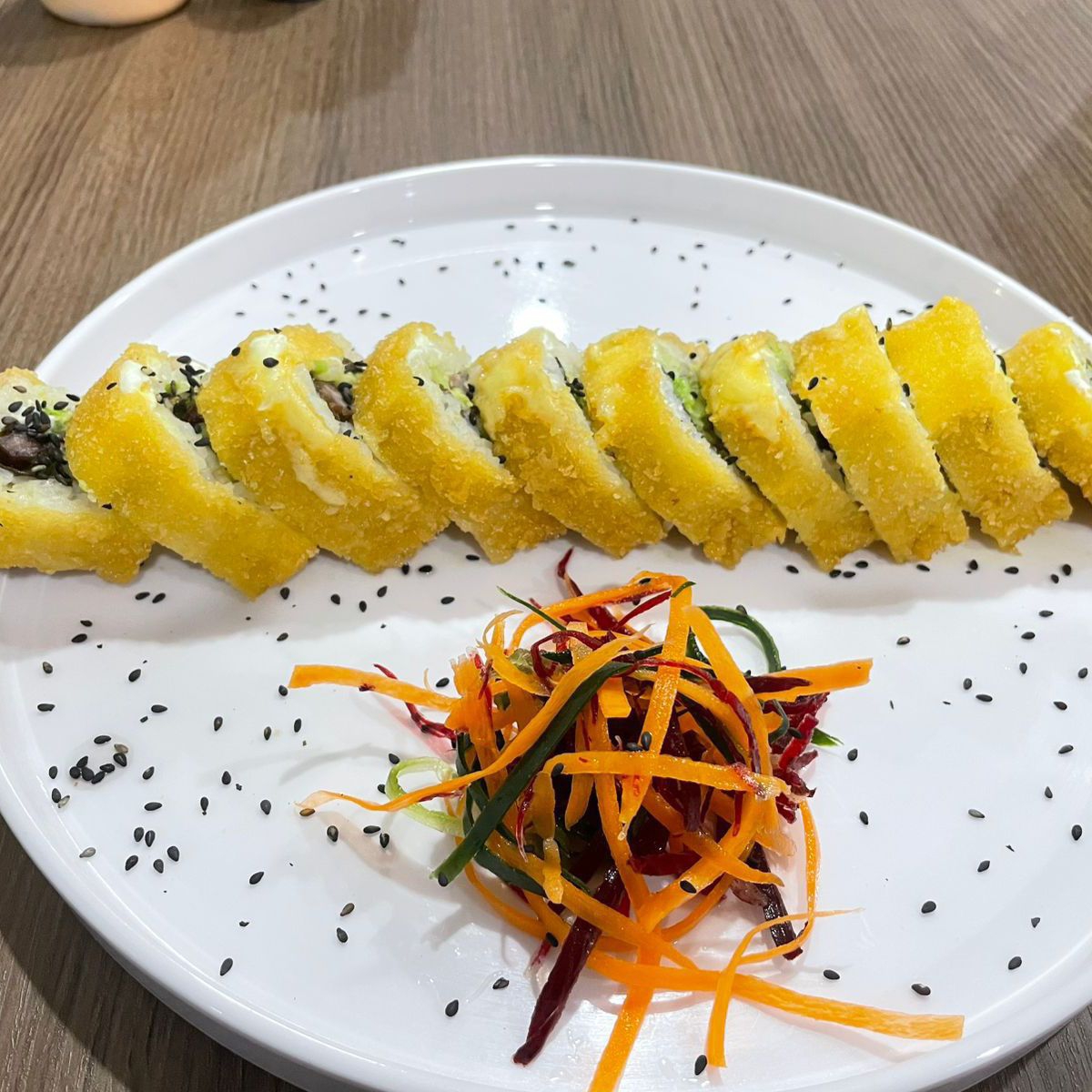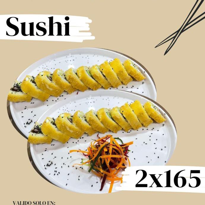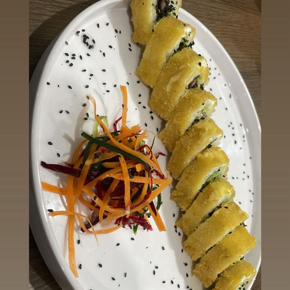 Rollo empanizado, con alga, camarón,res, pepino, aguacate,queso crema por dentro.