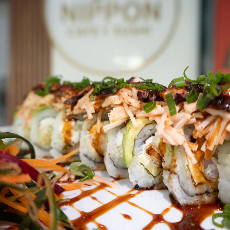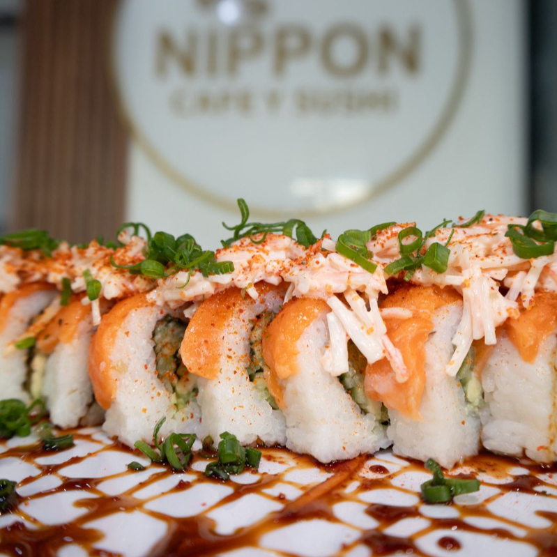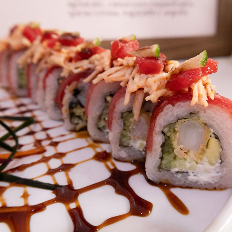 Rollo natural envuelto en atun, con alga, camaron, pepino, aguacate v queso crema por dentro, coronado con kanikama spicy, twist de limon y salsa nippon.