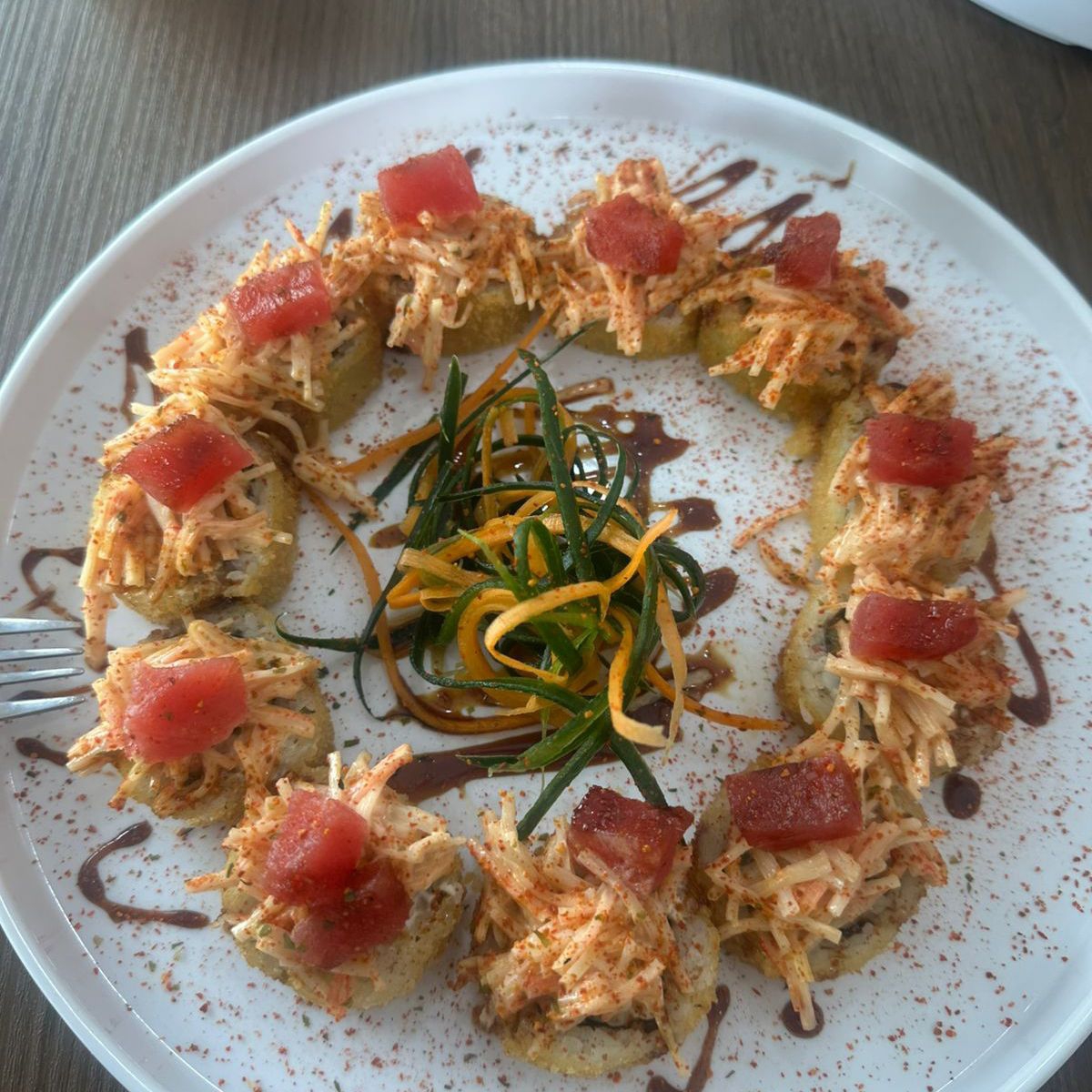 Rollo natural, envuelto en atun, con alga, camarón, pepino, aguacate,queso crema por dentro, coronado con kanikama,cebollin y togarashi.