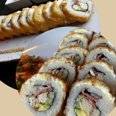 Rollo empanizado, envuelto en 3tipos de queso, con alga, camarón, pepino, aguacate,queso crema y res por dentro,