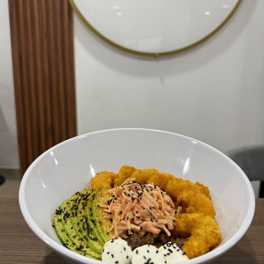 Arroz,Proteina, vegetales y coronado con tampico,aguacate y ajonjoli