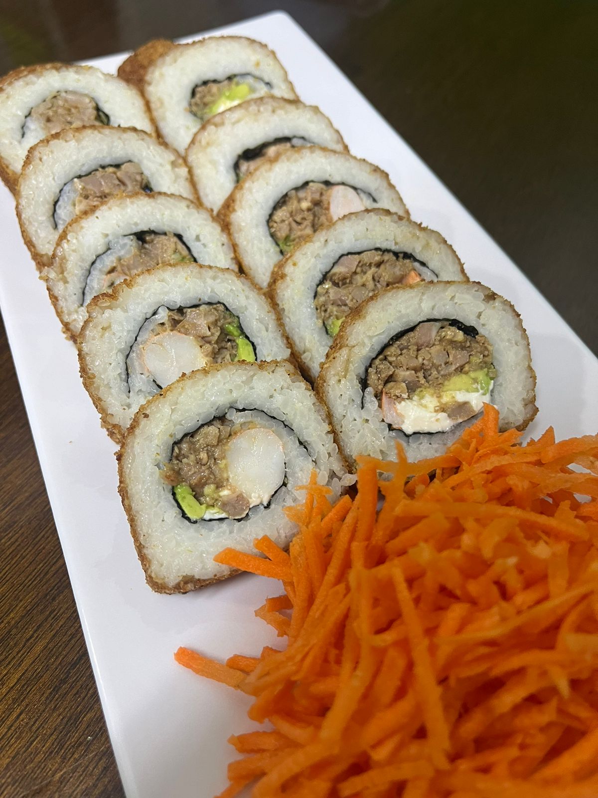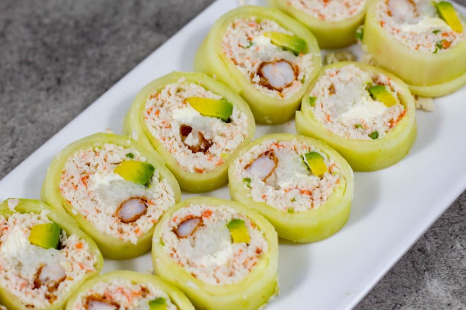 Relleno de aguacate, Philadelphia, tampico y camarón empanizado envuelto en pepino.