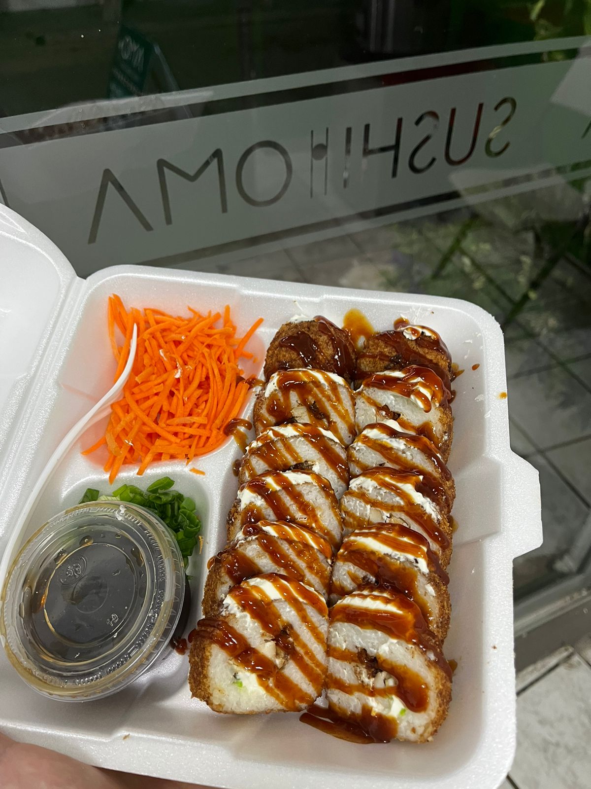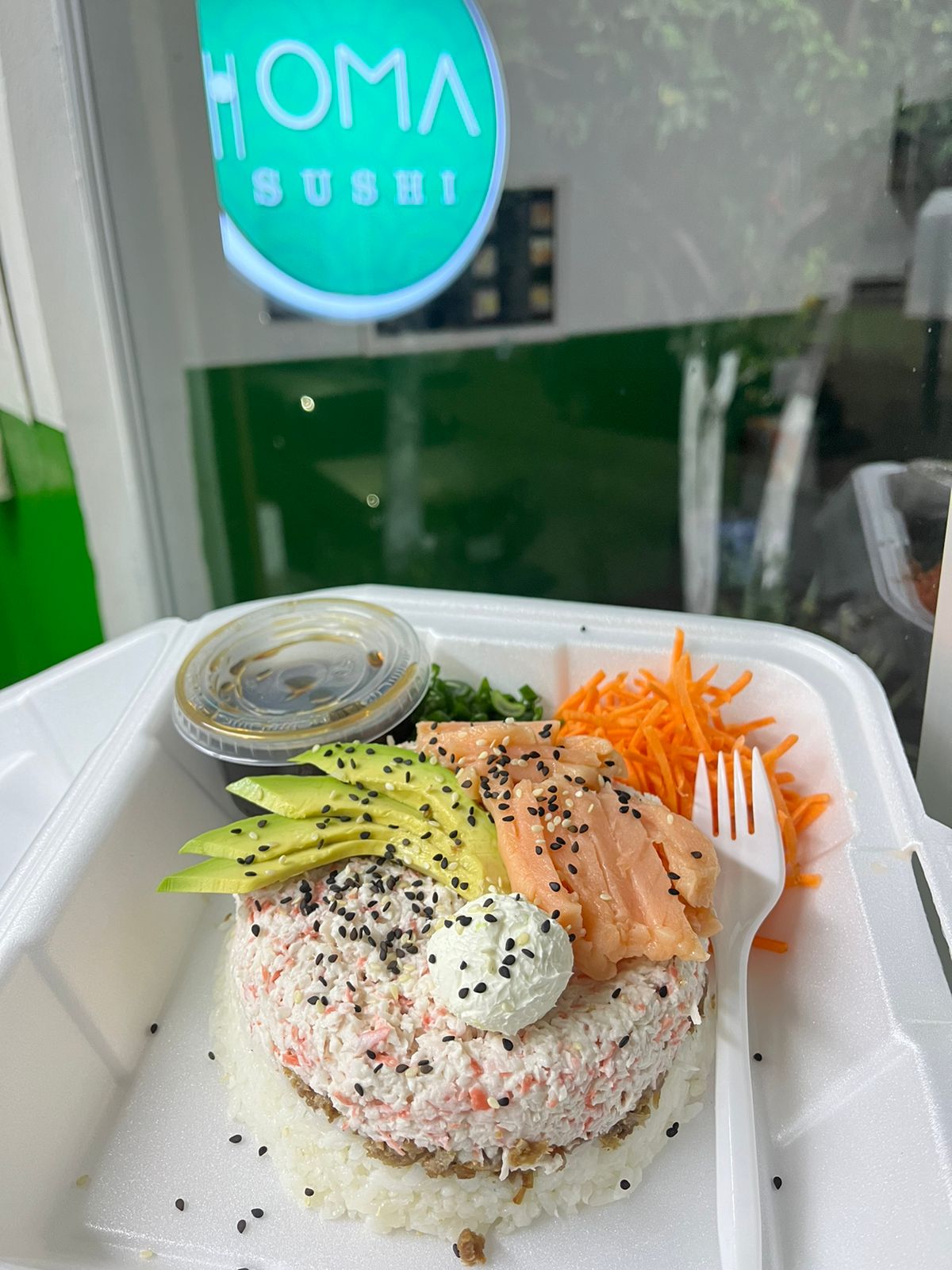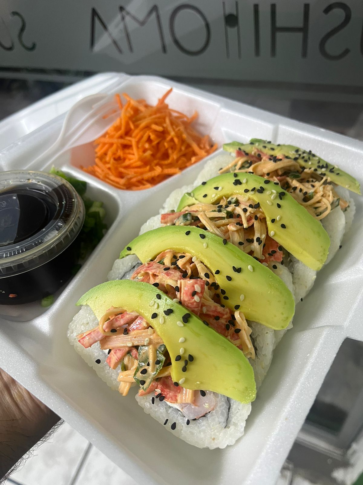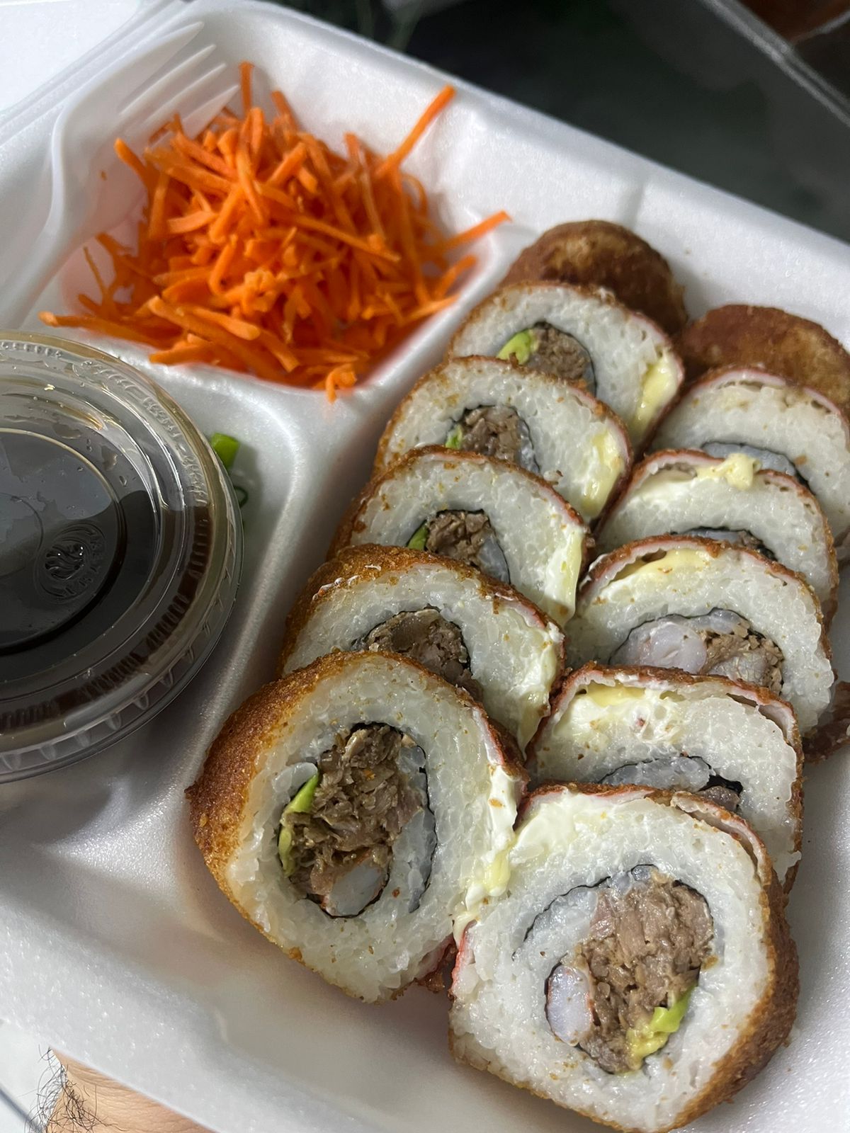 Cangrejo, camarón y Philadelphia. Por fuera: tampico, aguacate, bañado de salsa de anguila y ajonjolí.