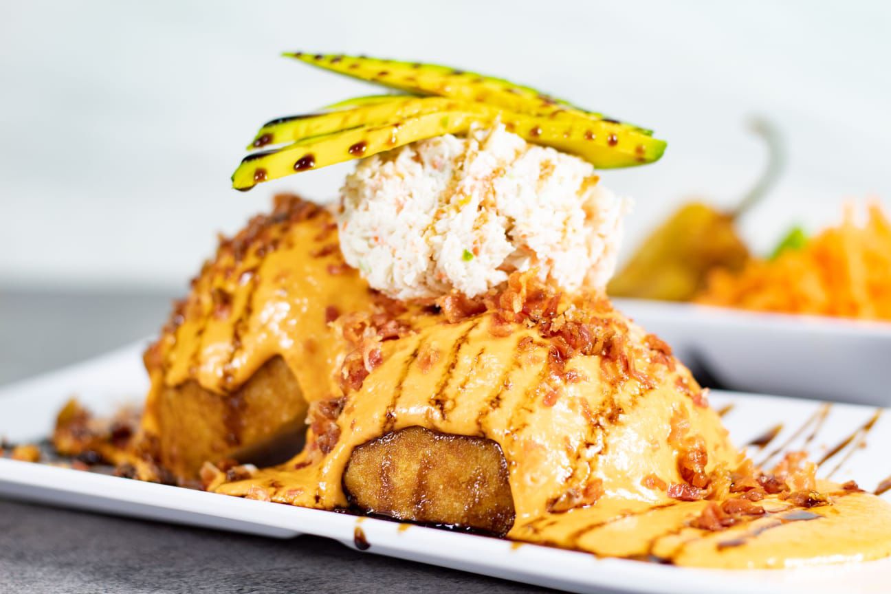 Relleno de pasta especial de camarón, tocino y aguacate con chihuahua. Por fuera: Philadelphia y cangrejo.