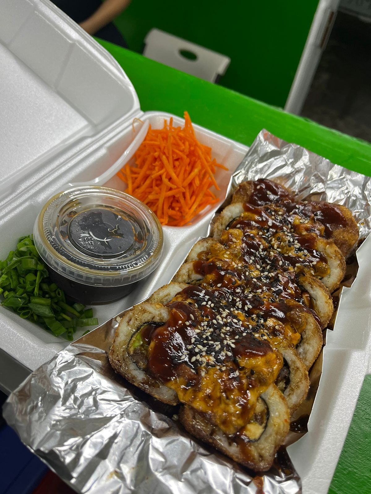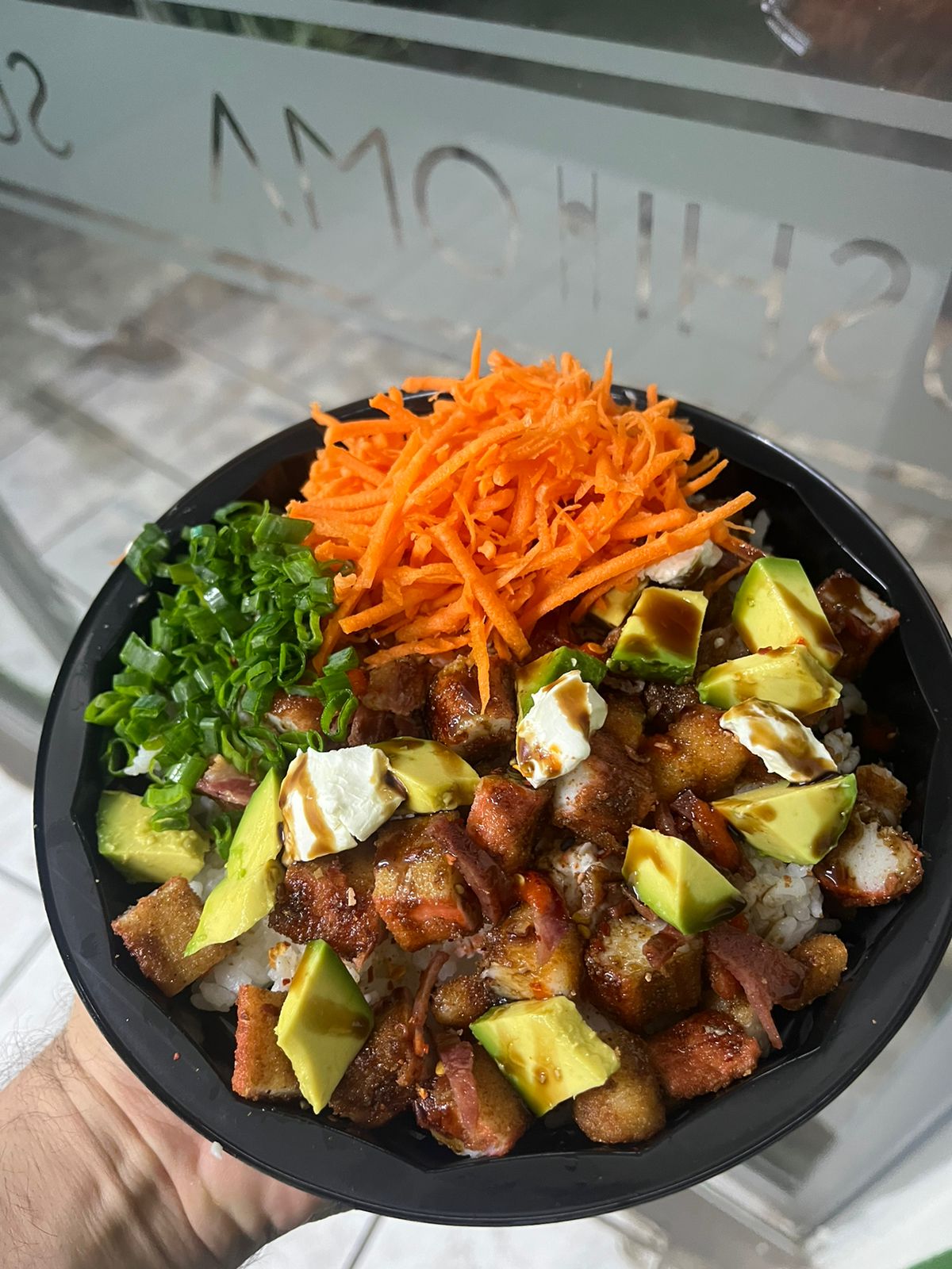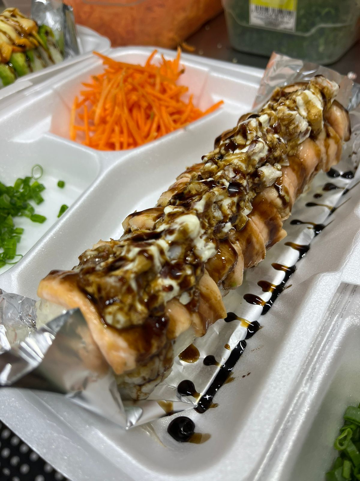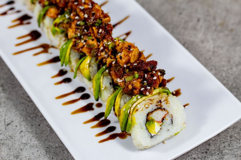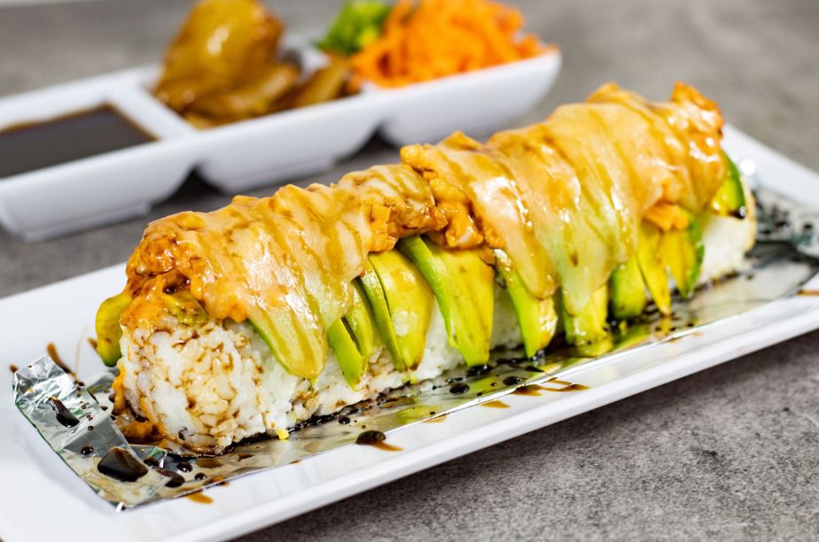 Pollo, res, Philadelphia y aguacate, por fuera: topping de camarón, res y tocino, bañado en salsa BBQ, salsa sriracha, salsa de anguila, aderezo chipotle y ajonjolí.