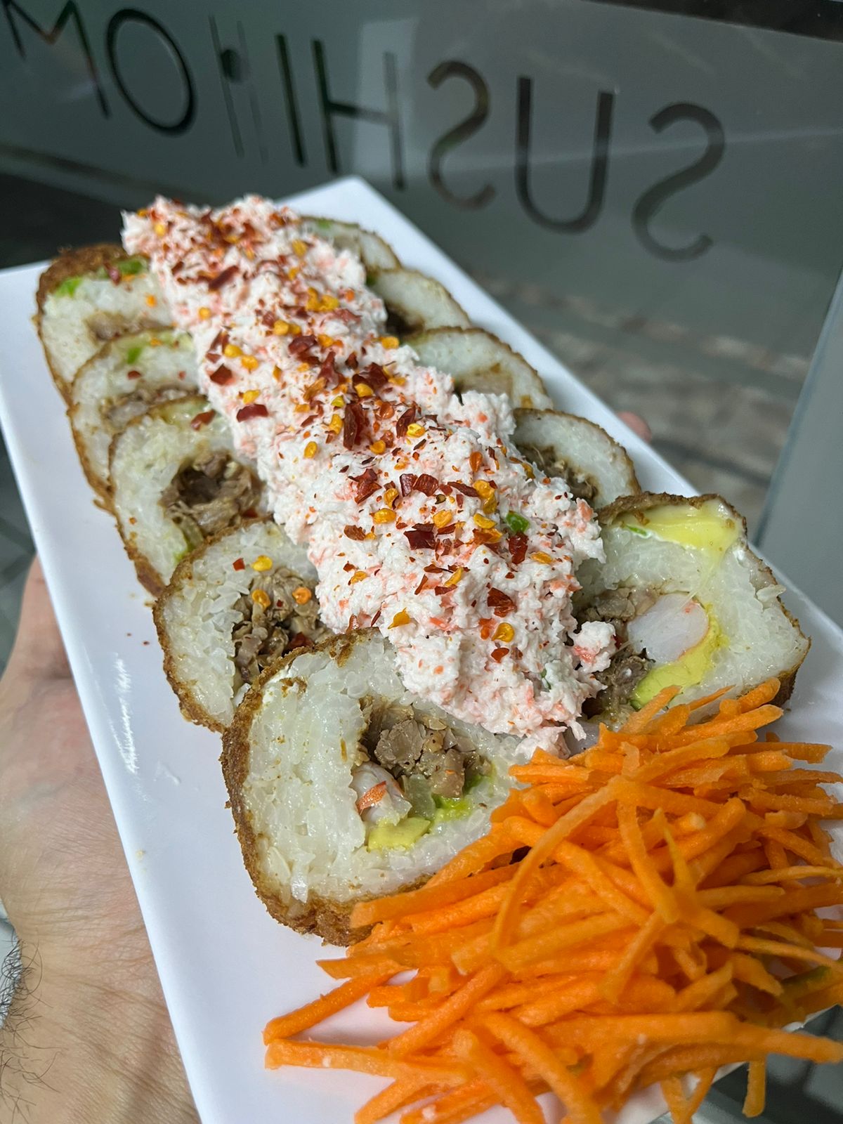 Camarón, res y chile caribe. Por fuera: queso chihuahua, Philadelphia, chile serrano, tampico y chile crush.