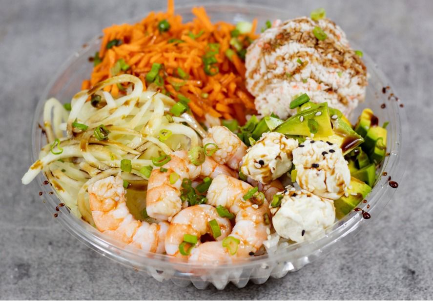 Camarón, cangrejo y Philadelphia, por fuera: forrado de aguacate, encima topping de camarón con cangrejo, gratinado con queso chihuahua y bañado en salsa de anguila.