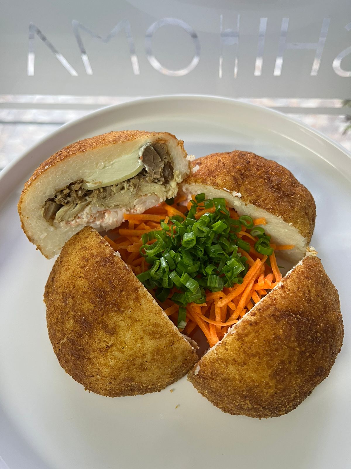 Pollo, cangrejo, Philadelphia y aguacate. Por fuera: queso gratinado y trocitos de tocino.