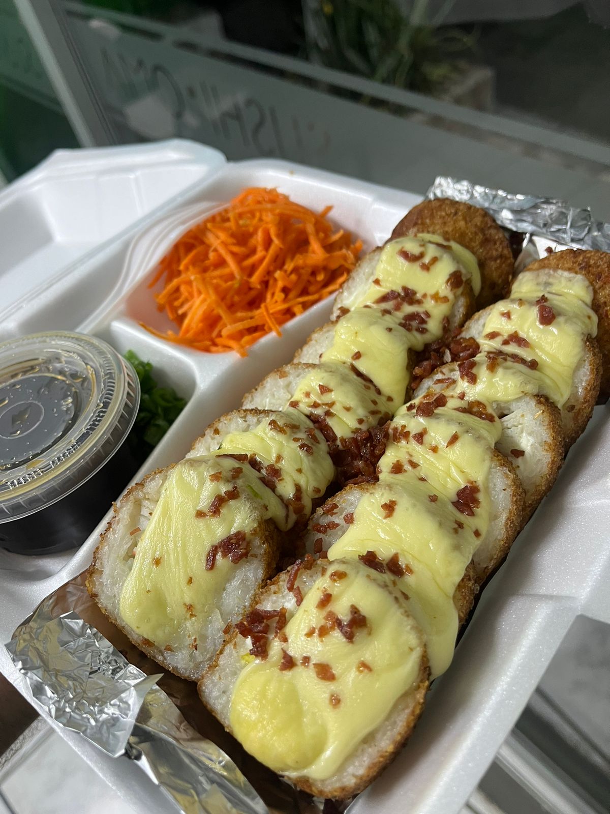 Res, tocino, Philadelphia y aguacate, por fuera: gratinado con queso chihuahua y serrano.