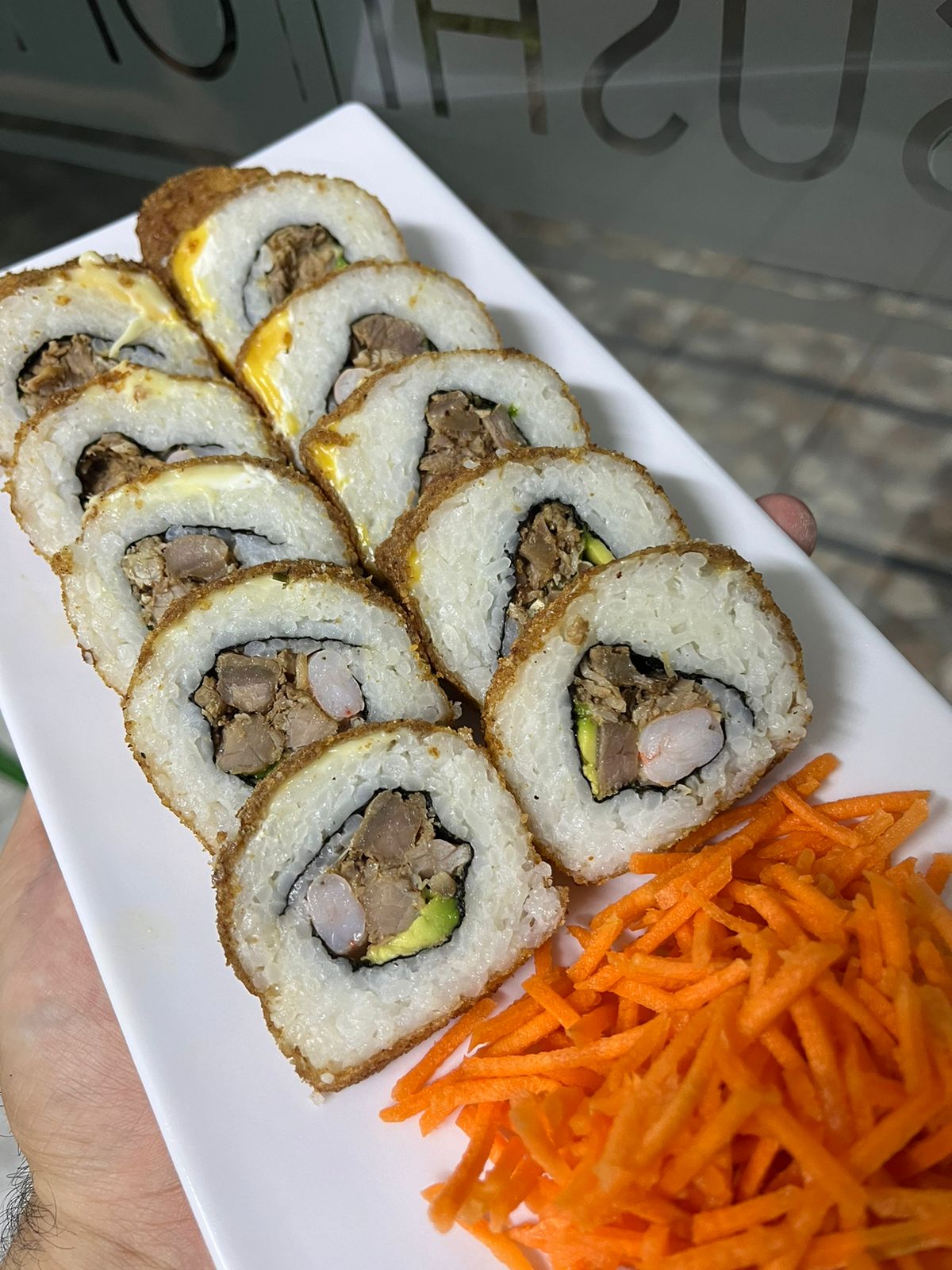 Cangrejo, camarón y aguacate. Por fuera: Philadelphia, cangrejo y topping especial de pollo y tocino.