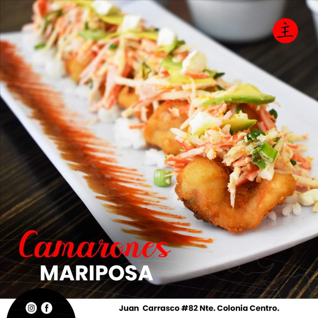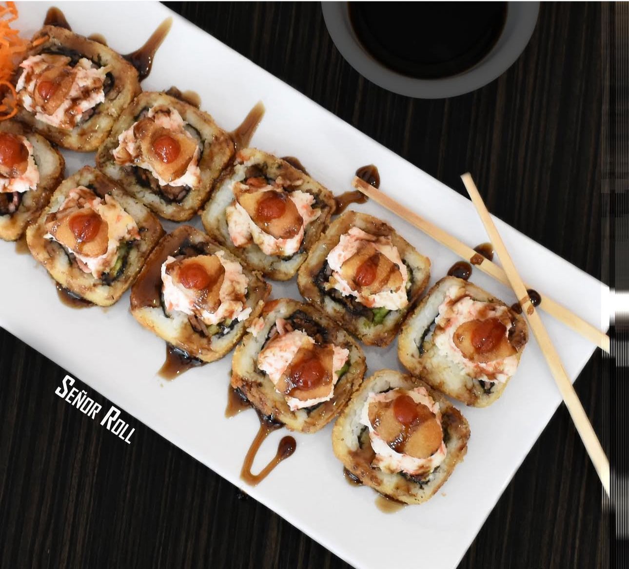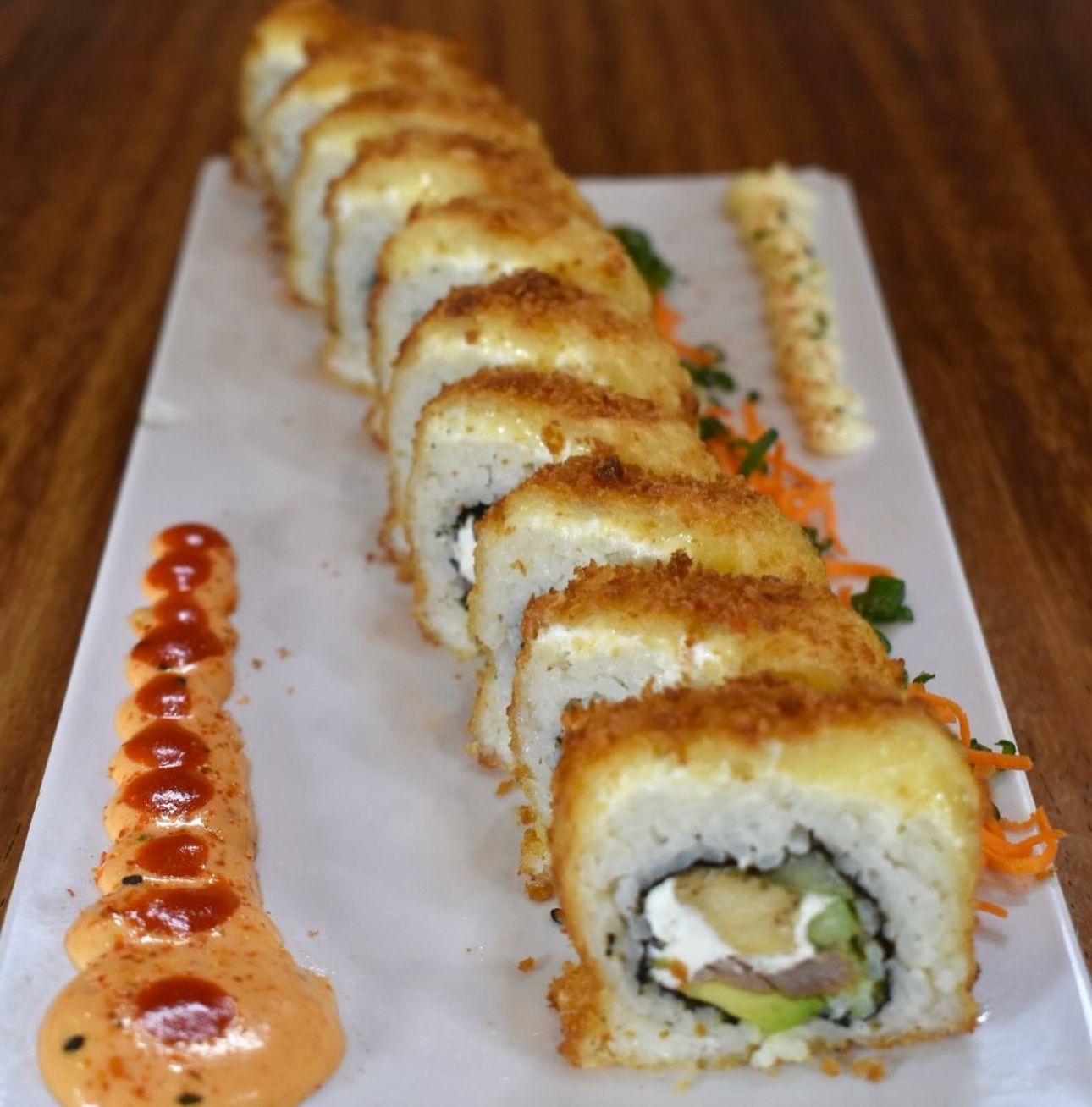 Por dentro Philadelphia, aguacate, pepino, res y tocino. Por fuera Philadelphia, queso Chihuahua, adornado con Tampico, camarón empanizado y un toque de Sriracha.