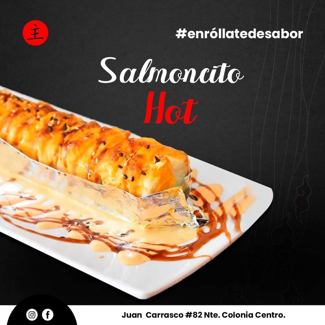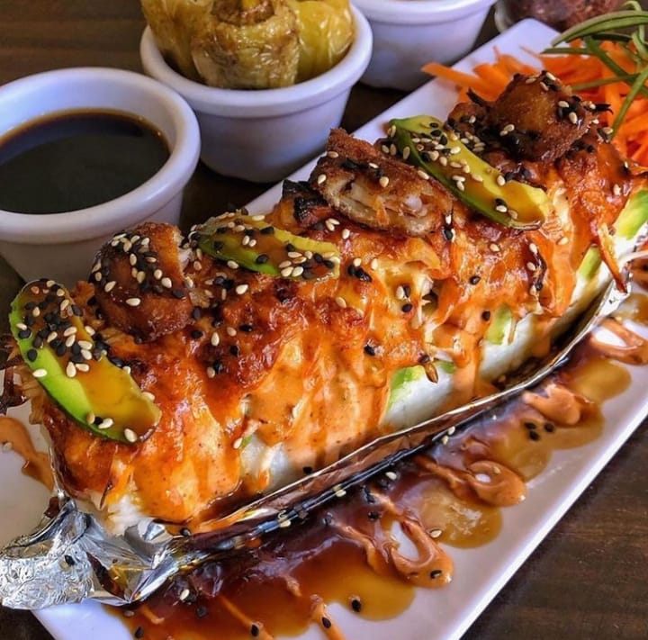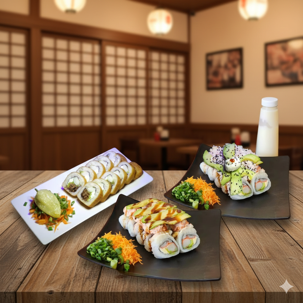 Por dentro Philadelphia, aguacate, pepino, res y tocino. Por fuera Philadelphia, queso Chihuahua, adornado con Tampico, camarón empanizado y un toque de Sriracha.
