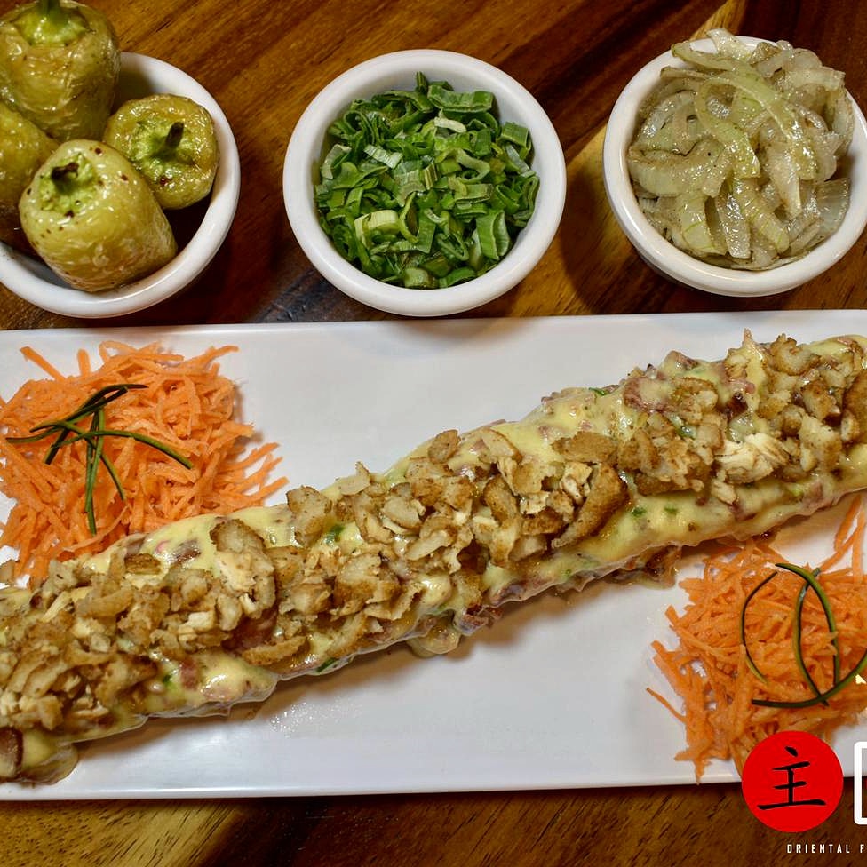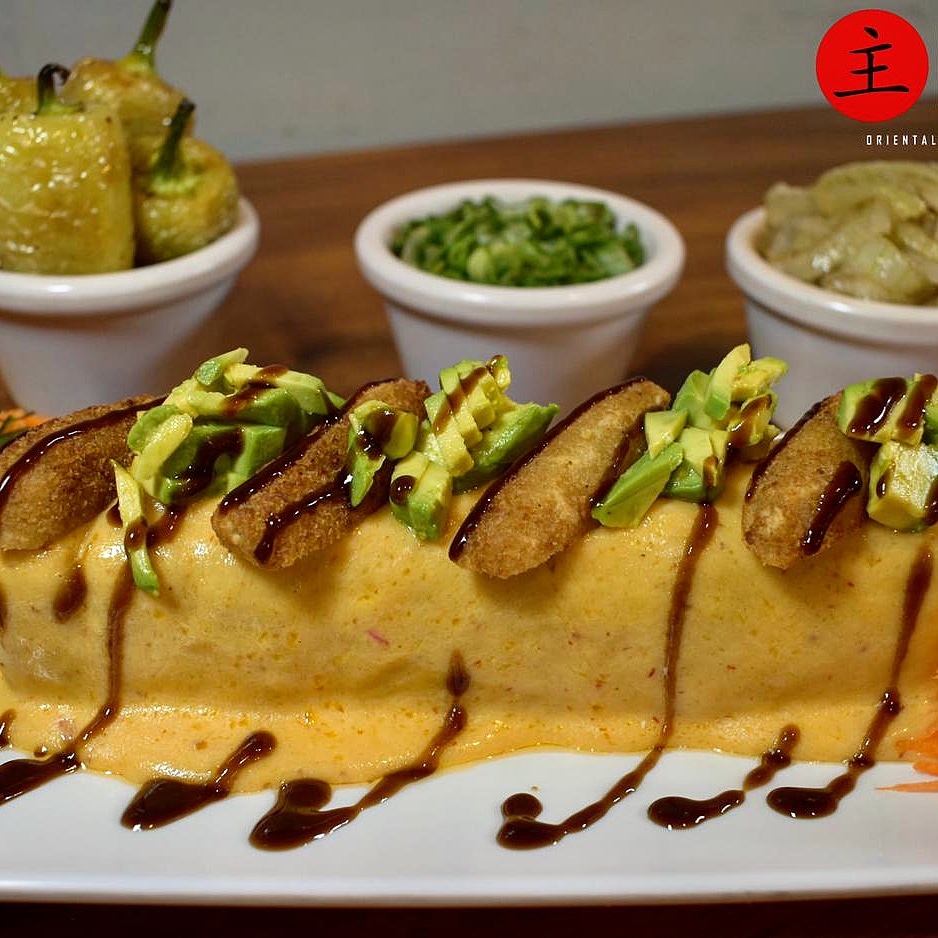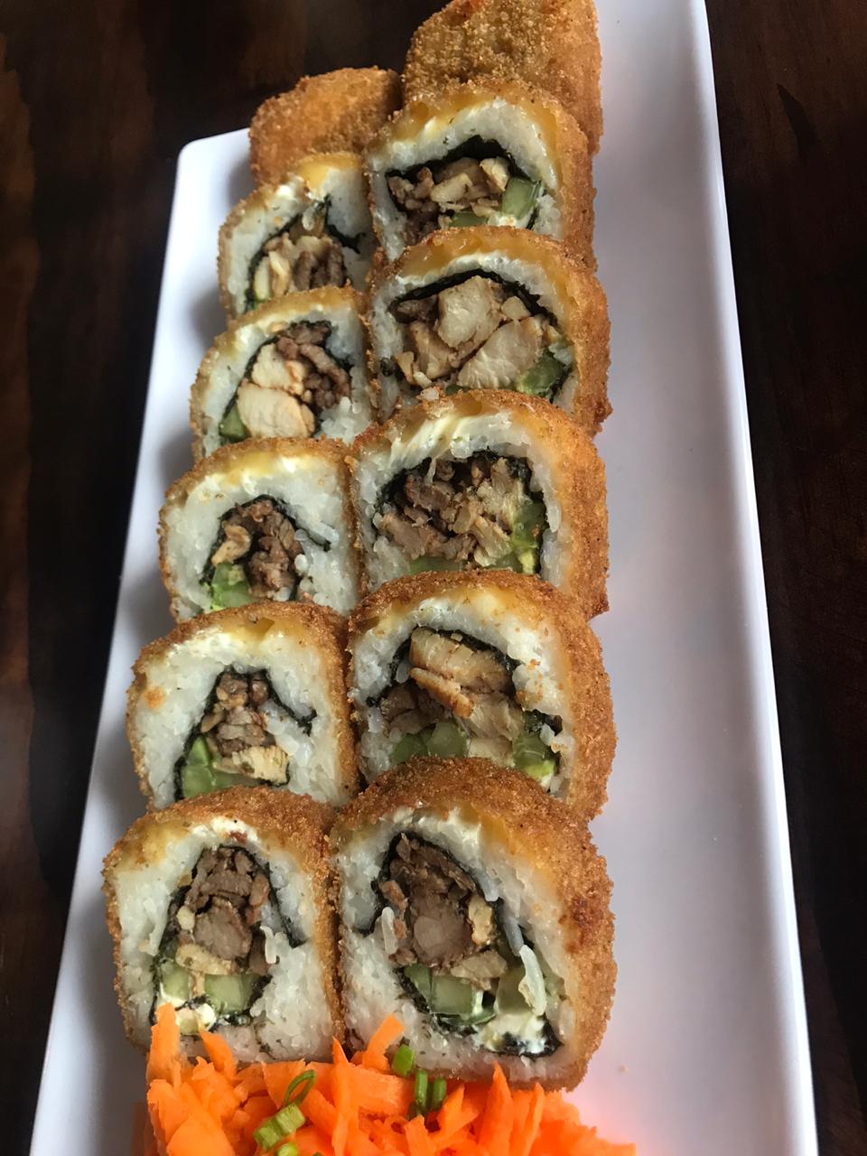 Por dentro Philadelphia, aguacate, pepino, res y pollo. Por fuera gratinado con chipotle, adornado con aguacate, pollo empanizado y ajonjolí.